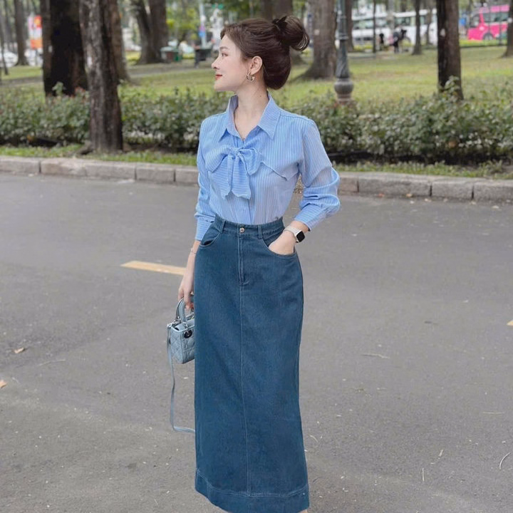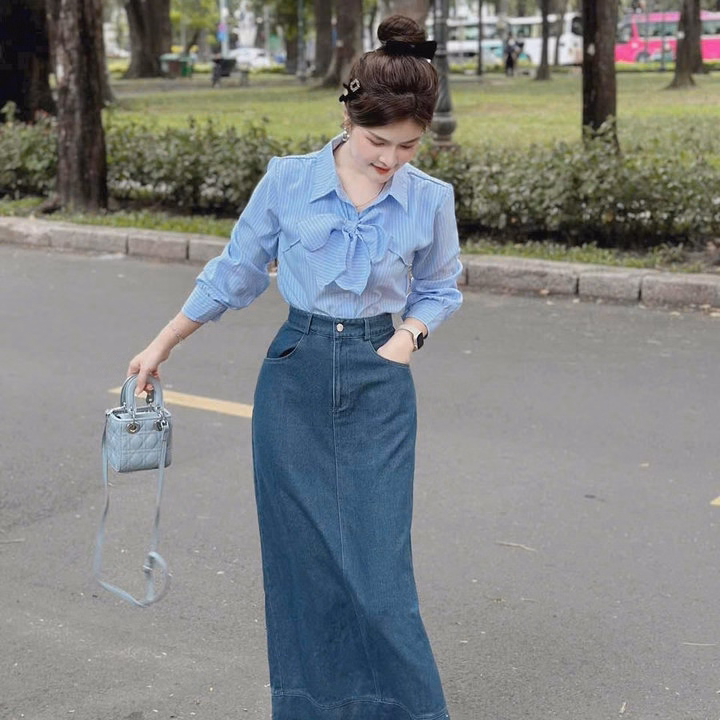 Set Áo Kate Sọc Phối Chân Váy Dài Denim Bh110D- Sam Store