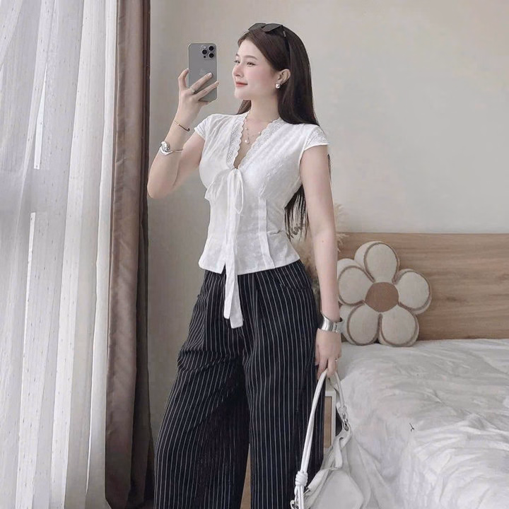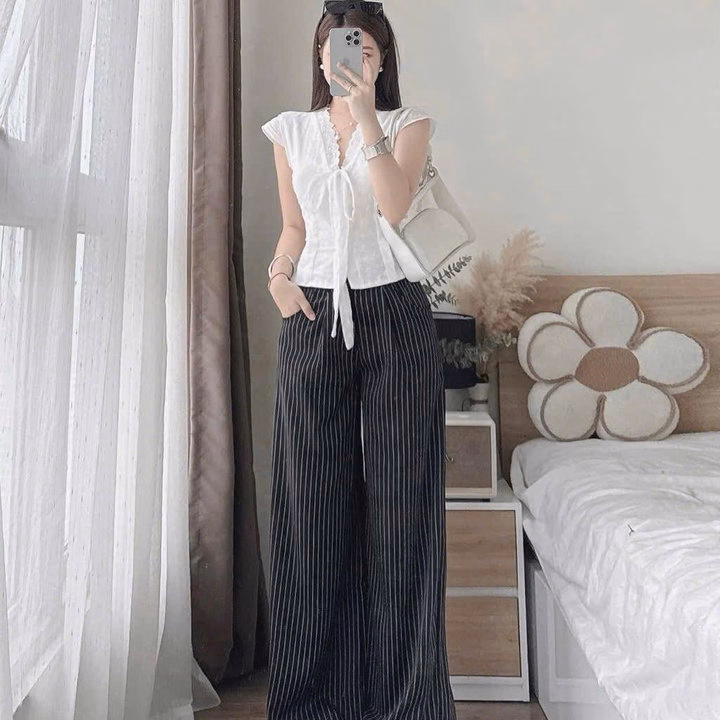 Set Áo Phối Ren Nơ Xinh Mix Quần Sọc Ống Suông Tb132Us