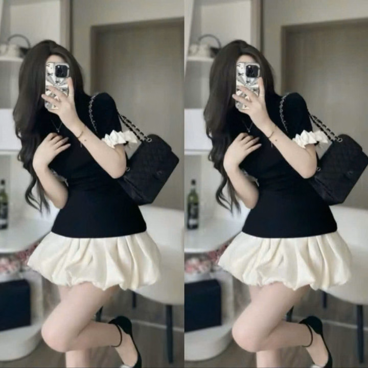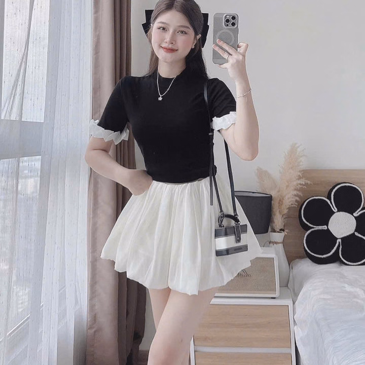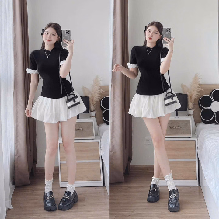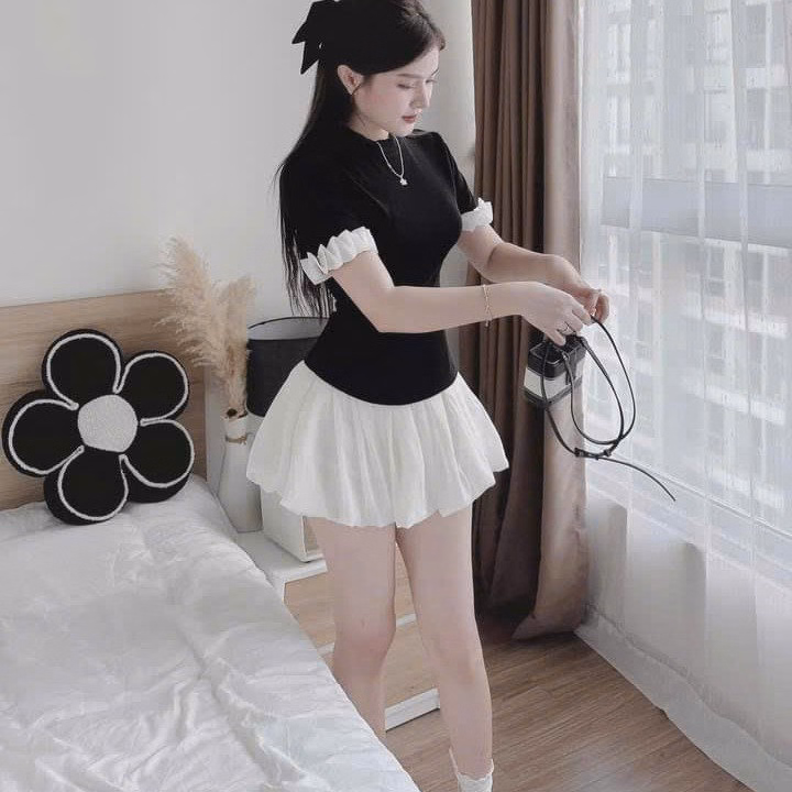 Chất liệu: áo thun gân tăm lạnh, chân váy vải tơ nến