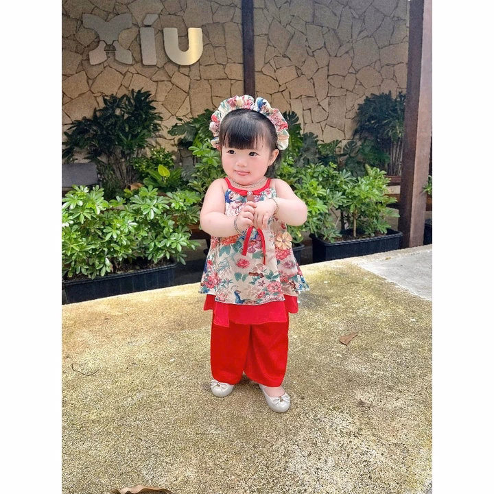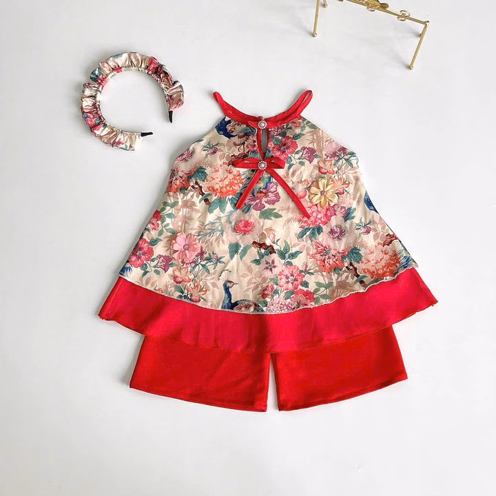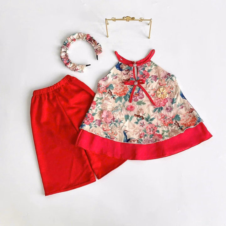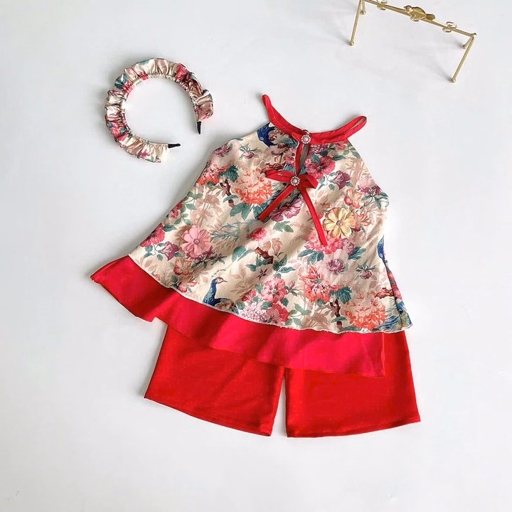Set Áo Sát Nách Cổ Yếm Hoa Quần Lụa Kèm Cài Cho Bé Gái Sơ Sinh 1 2 3 4 5 Tuổi Từ 3-18Kg Dành Cho Bé Gái