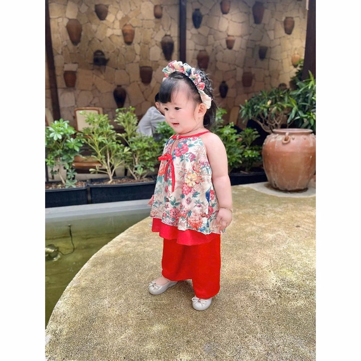 Set Áo Sát Nách Cổ Yếm Hoa Quần Lụa Kèm Cài Cho Bé Gái Sơ Sinh 1 2 3 4 5 Tuổi Từ 3-18kg Dành Cho Bé Gái