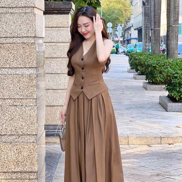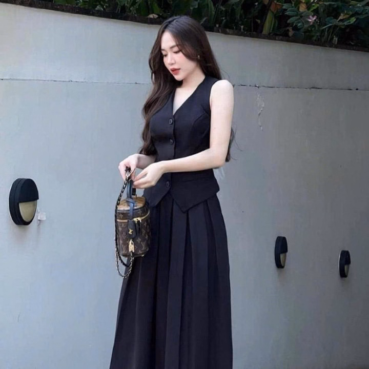 Set Áo Sát Nách Cột Dây Sau Phối Chân Váy Mango Khóa Kéo Có Túi Bt100H- Sam Store