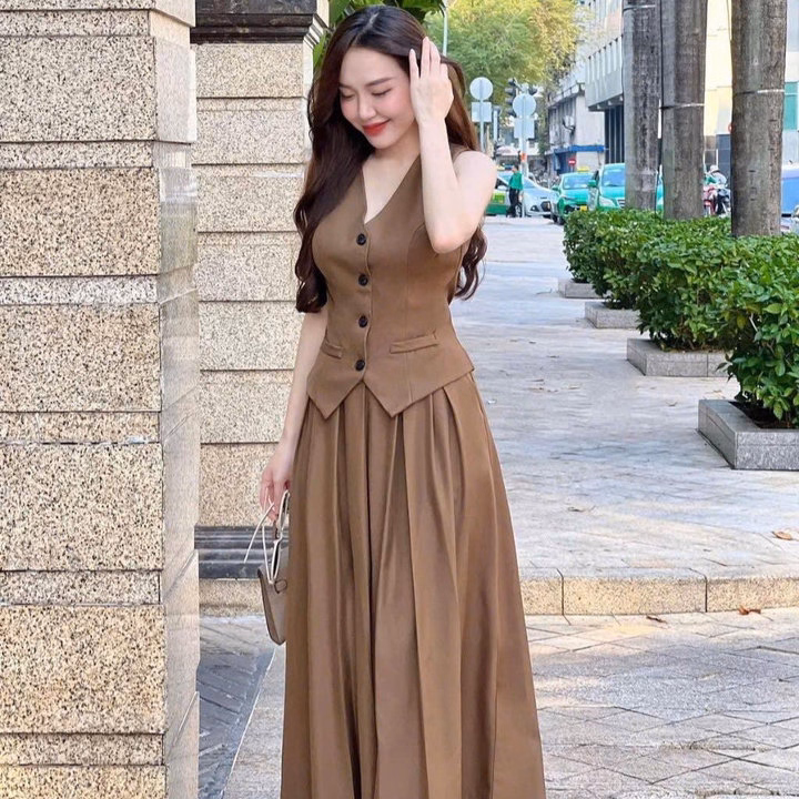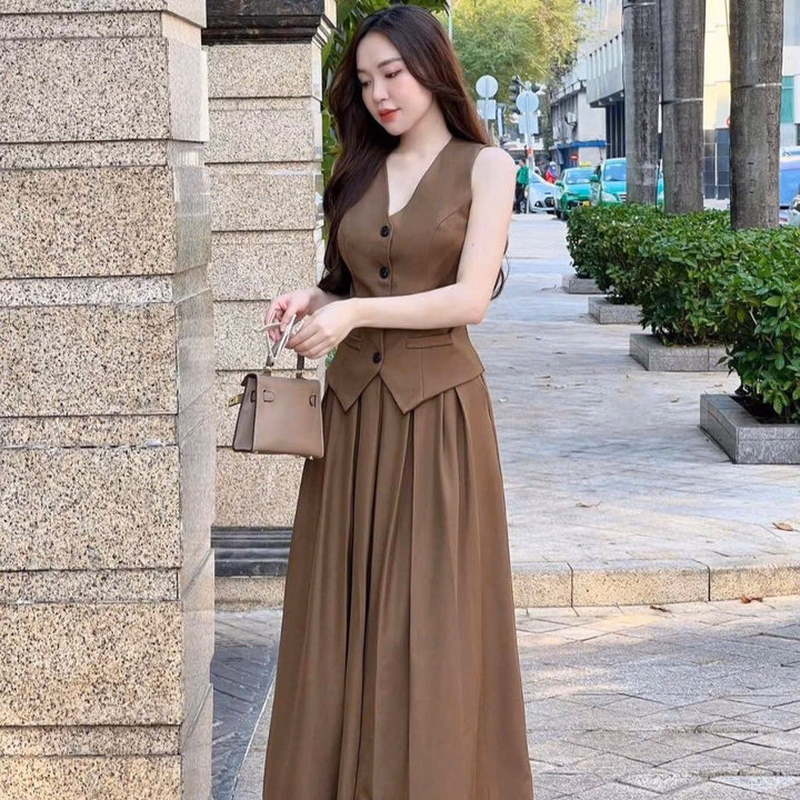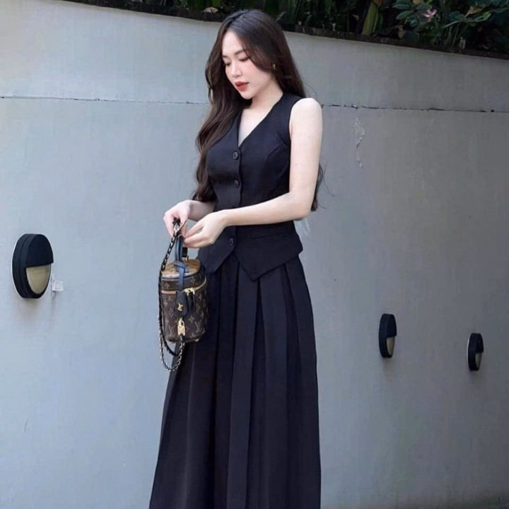 Set Áo Sát Nách Cột Dây Sau Phối Chân Váy Mango Khóa Kéo Có Túi St001L- Nana House