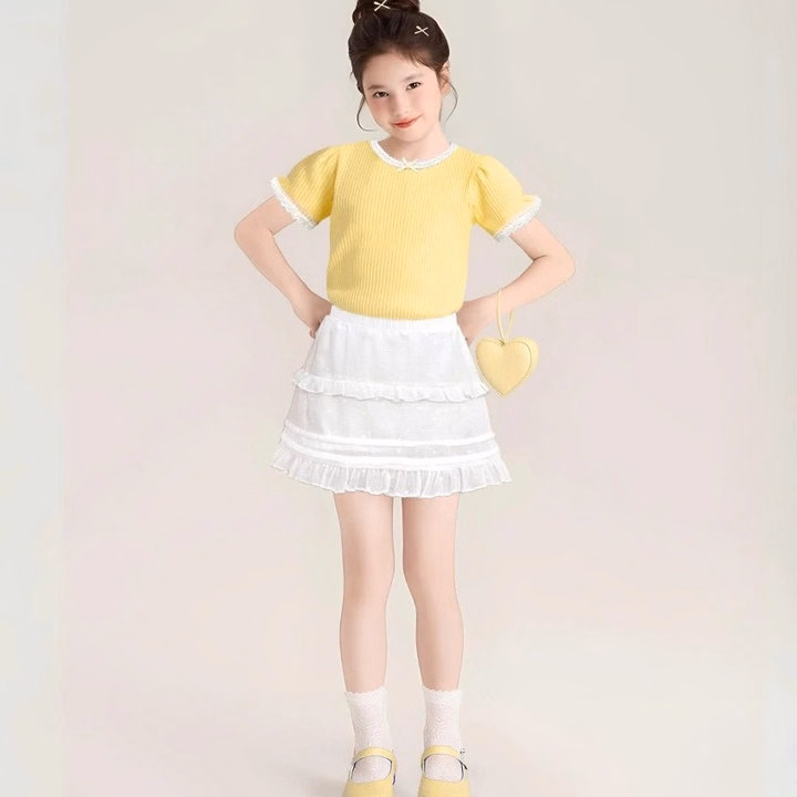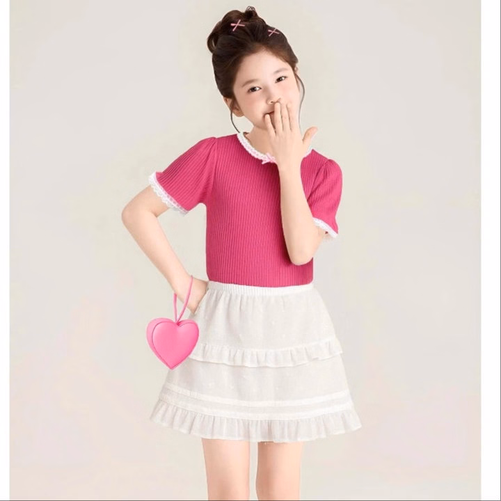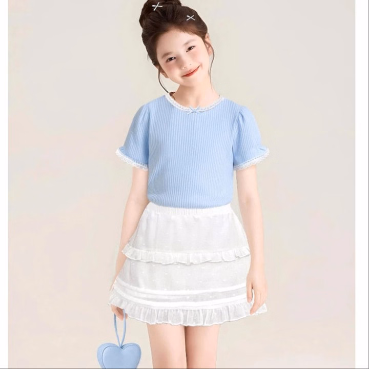 Set Áo Thun Gân Viền Ren Mix Chân Váy Xòe Bé Gái Dễ Thương Từ 12-36Kg Dành Cho Bé Gái