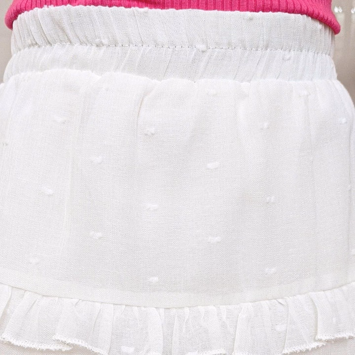 3. Chất liệu : Áo thun gân bo nhẹ co giãn 4C, mềm mại, mát mẻ, cực kỳ thoải mái. Tay ngắn, cổ tròn phối ren trắng + nơ đính nổi, tạo điểm nhấn đáng yêu. Chân váy xòe phối tầng bèo, dáng bồng nhẹ, có lớp lót lụa mịn + quần chip an toàn. Vải boi cao cấp, nổi bật với họa tiết thêu hoa 3D, tinh tế và xịn sò.