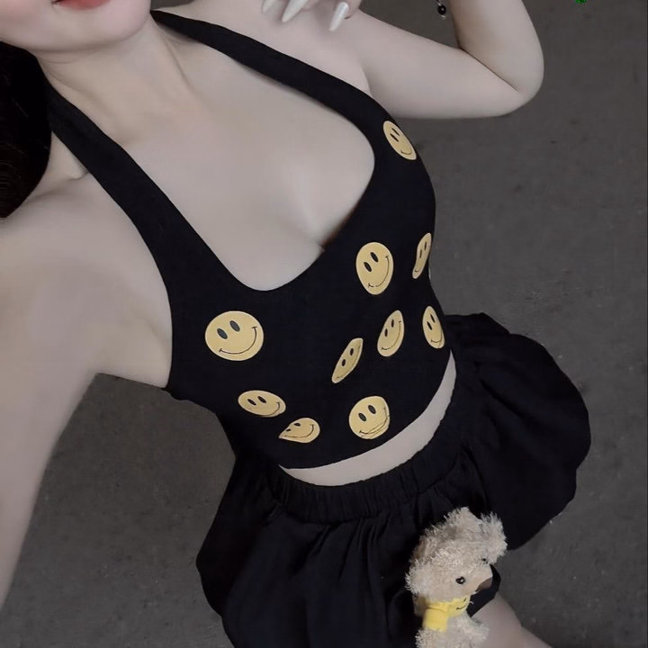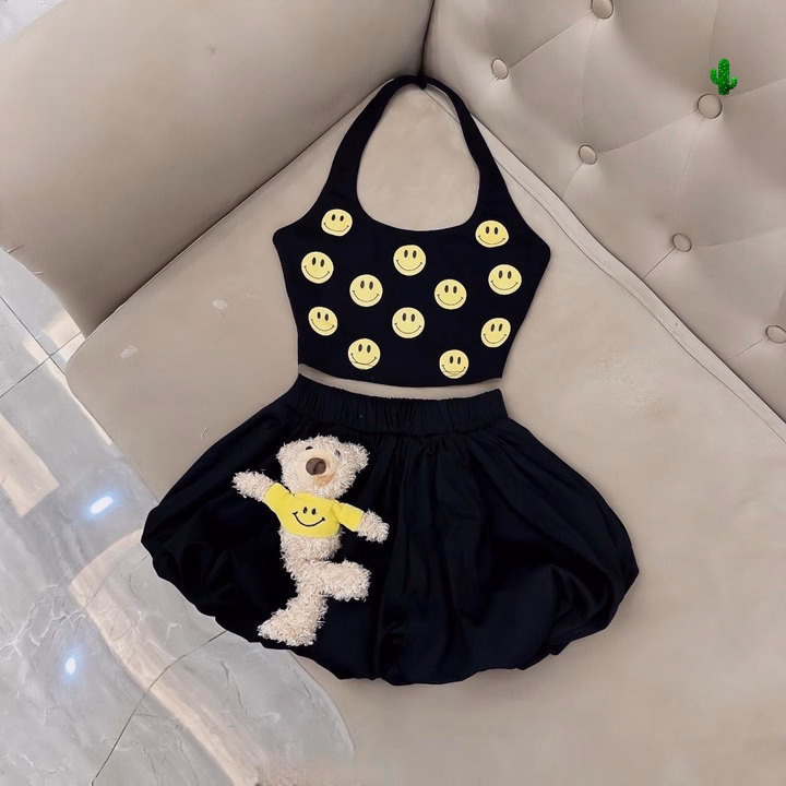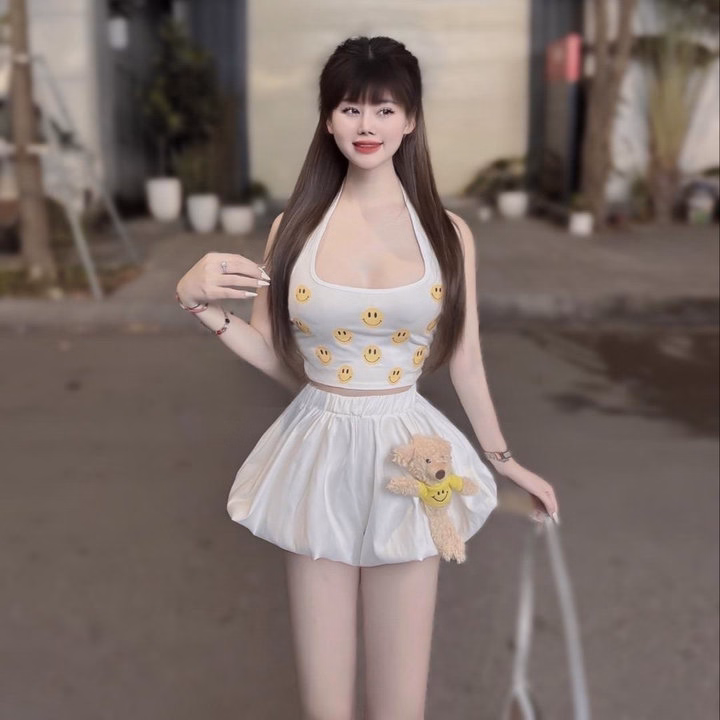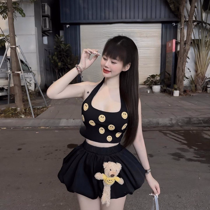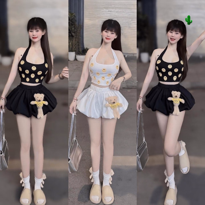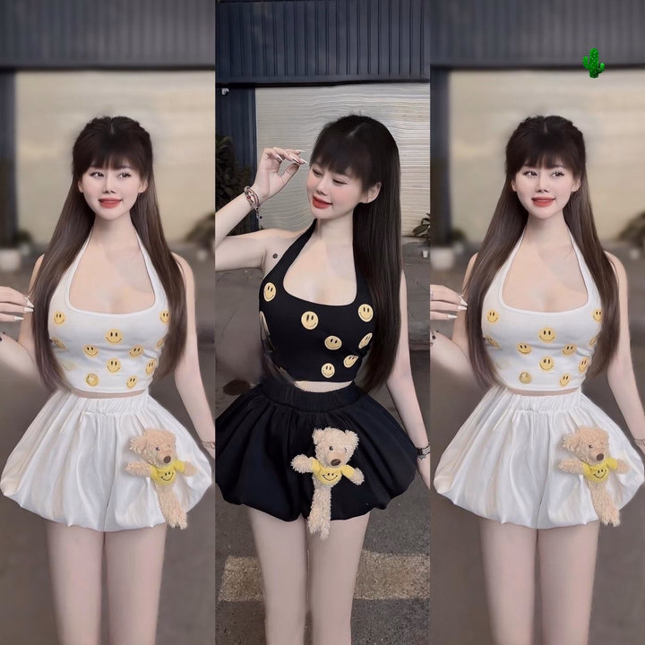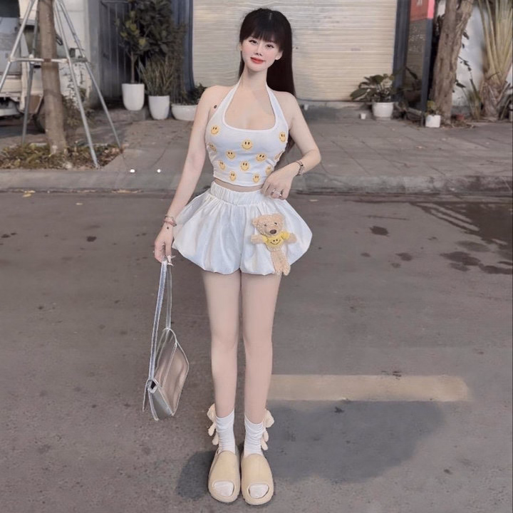 💕 Tên Sp : set áo yếm icon (có bra) + quần bí hai lớp + gấu trơn đính