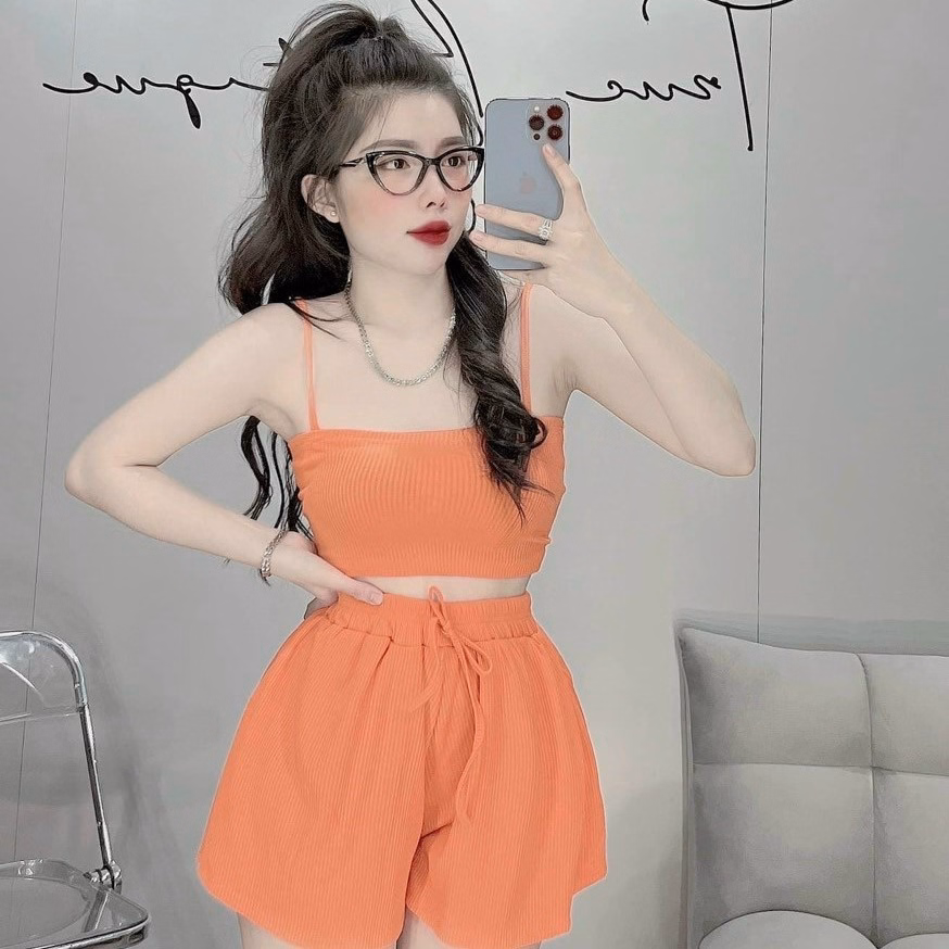 Sản phẩm gồm áo 2 dây dáng croptop ôm body kèm quần.