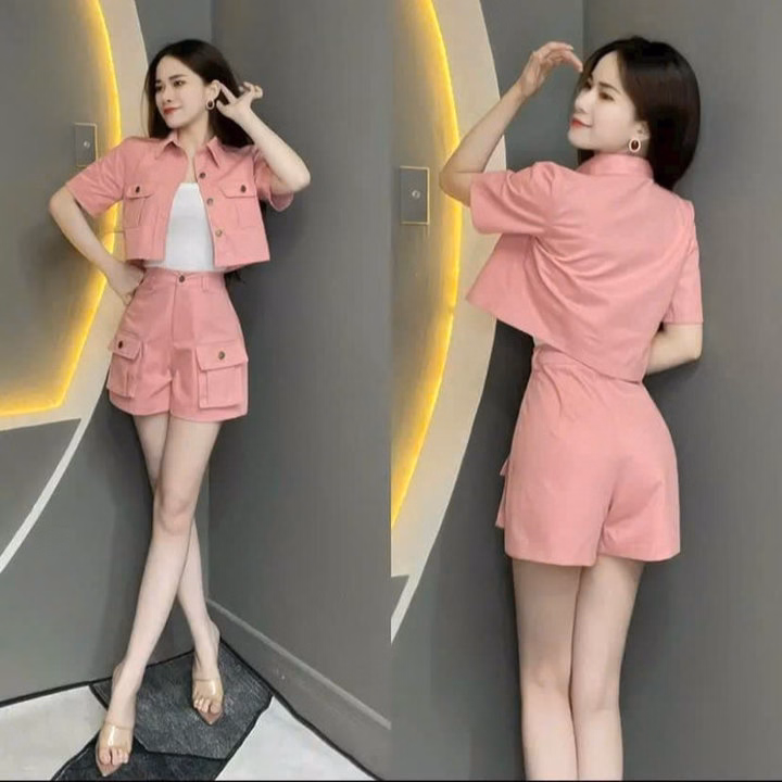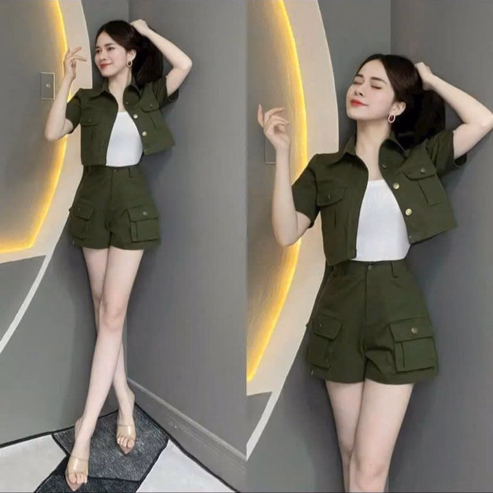 Set Bộ Đồ Nữ 3 Món Kaki Quần Túi Hộp Phối Áo Crotop 2 Dây Sh1053- Sam Store