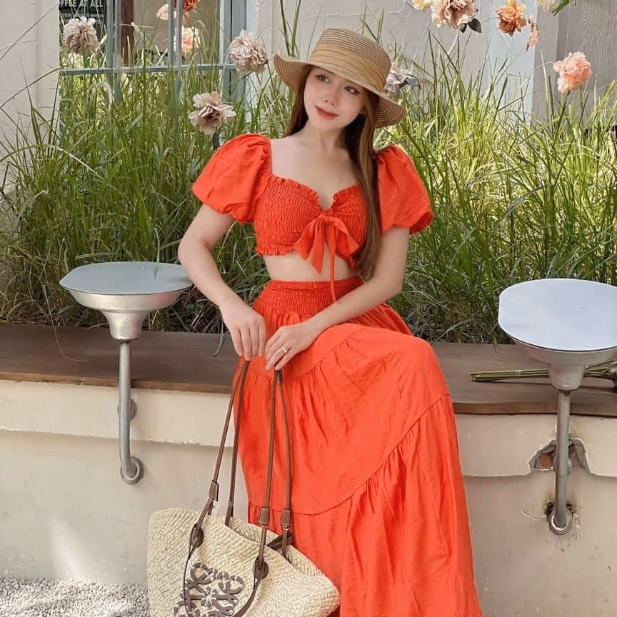 Set Bộ Đồ Nữ Áo Crotop Nhún Ngực Tay Phồng Mix Chân Váy Dài Sa155- Sam Store