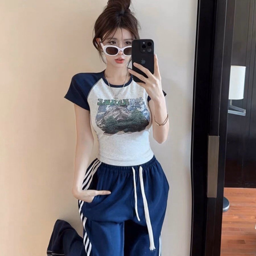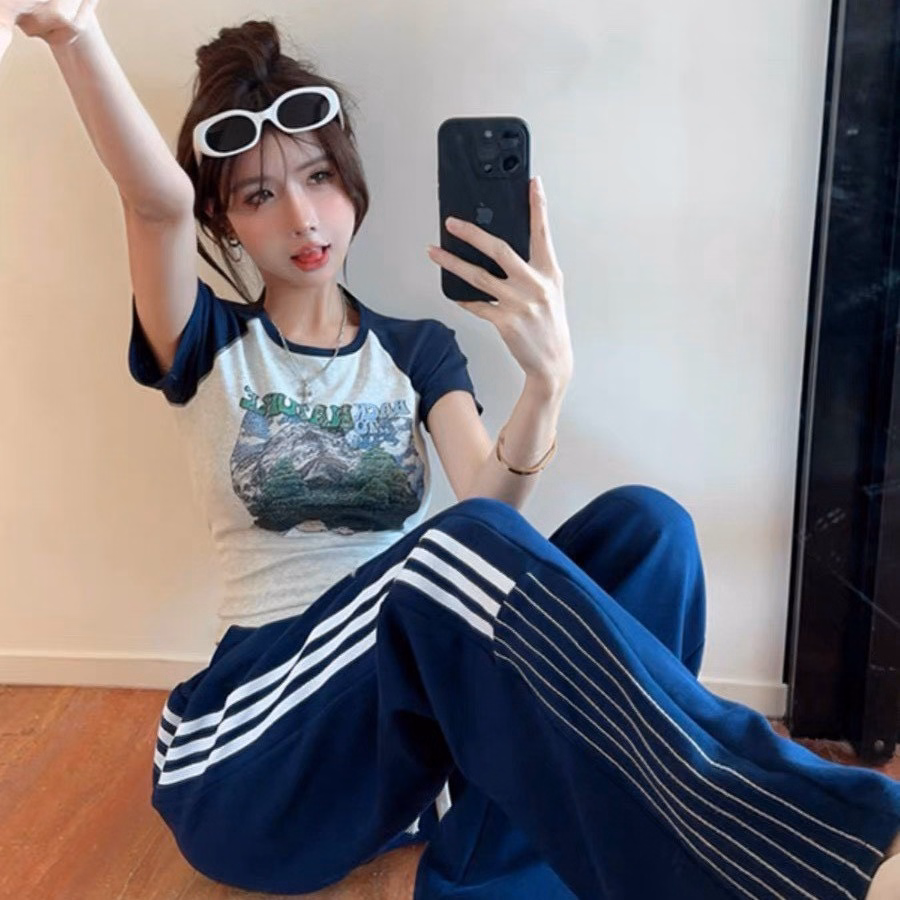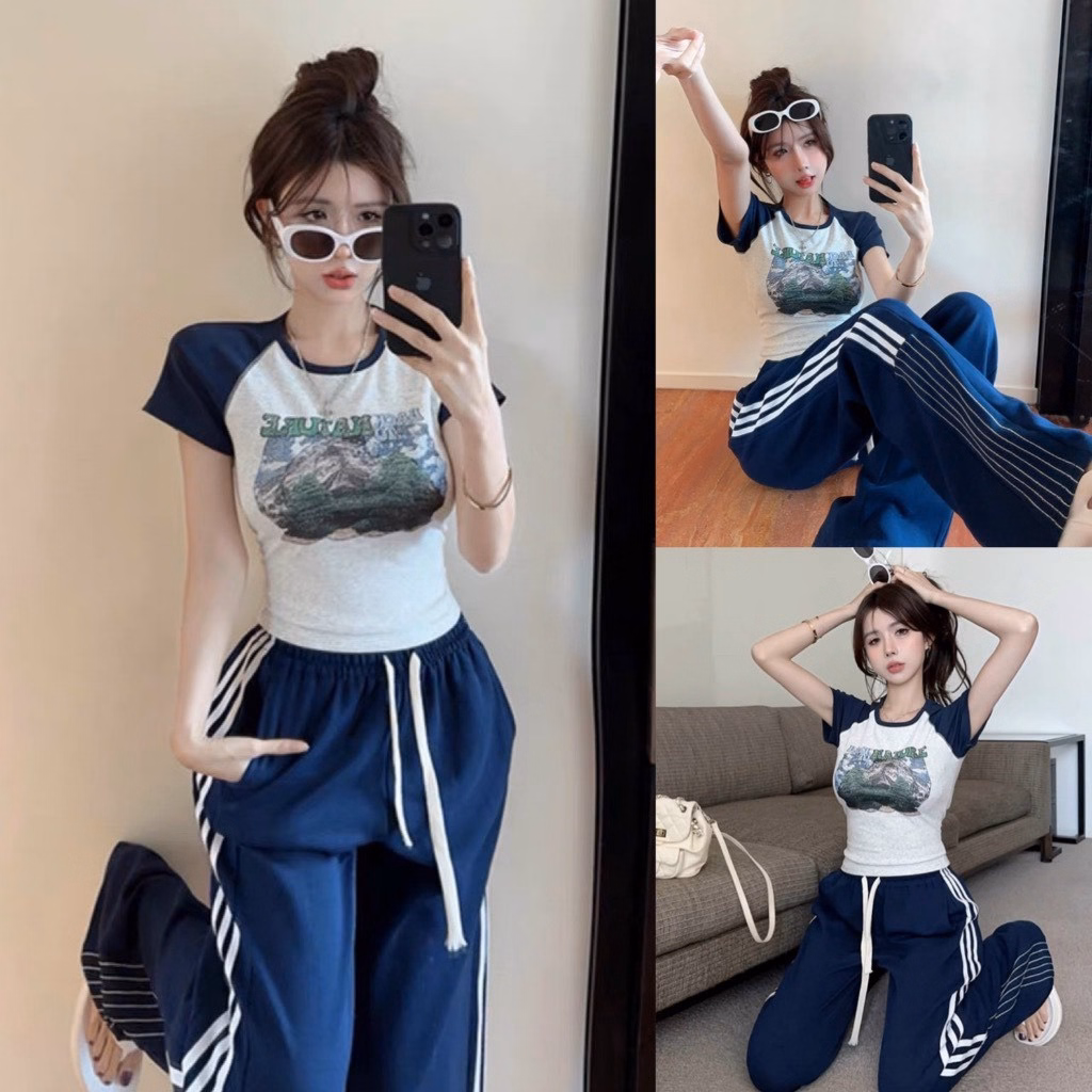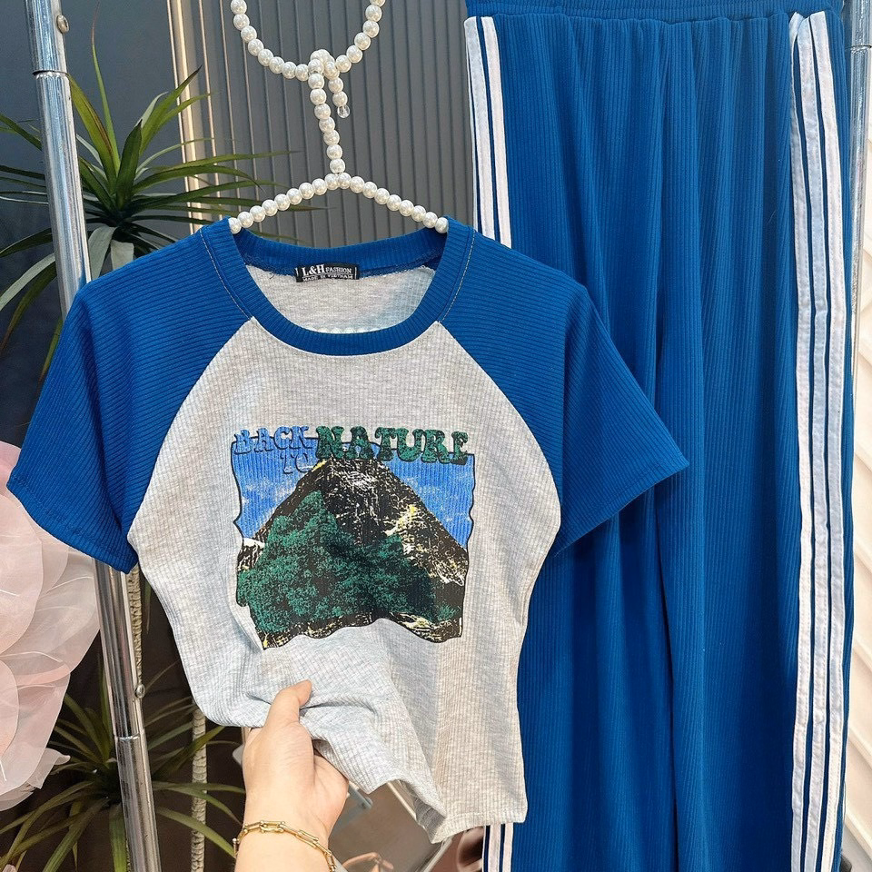 Set Bộ Đồ Nữ Áo Thun Body In Họa Tiết Mix Quần Ống Suông Phối Viền Sọc Bt608 – Nana House