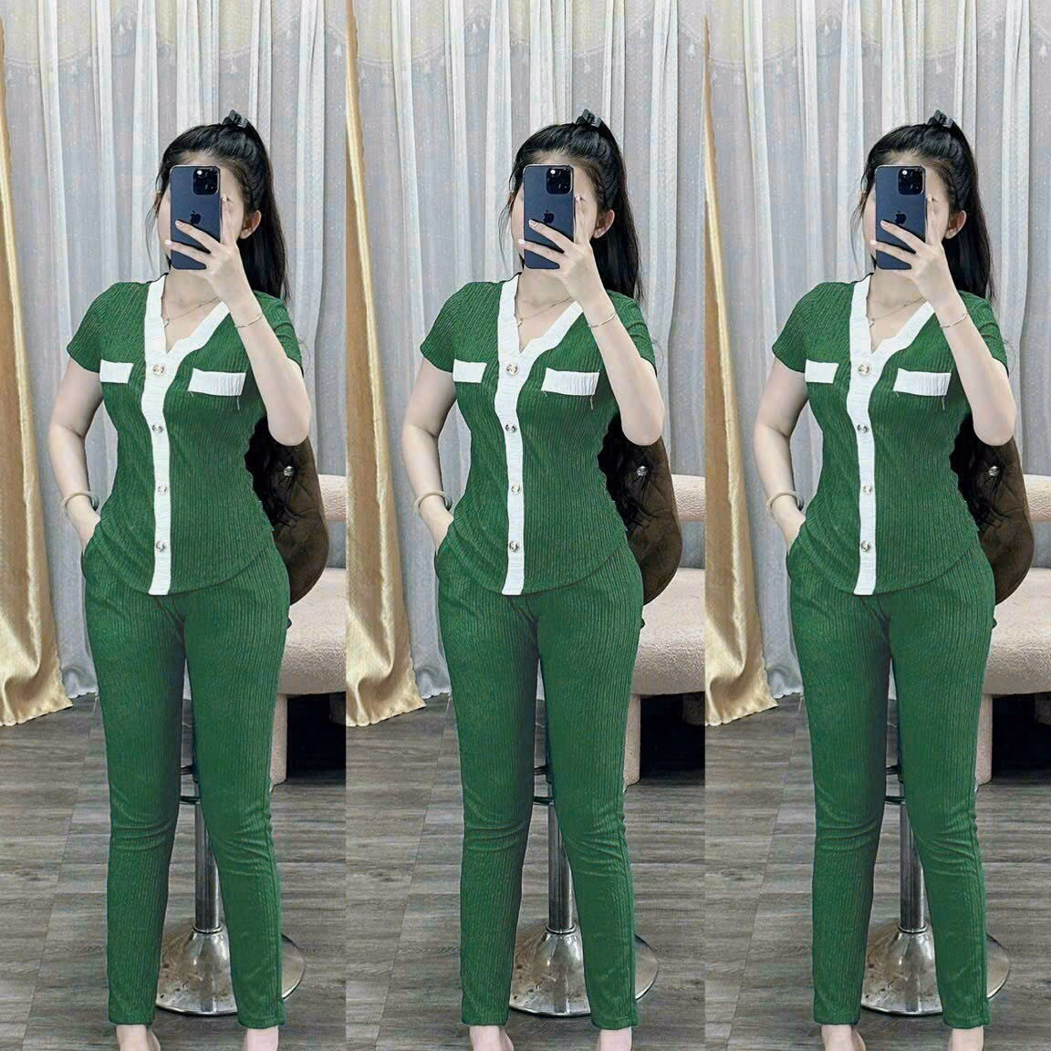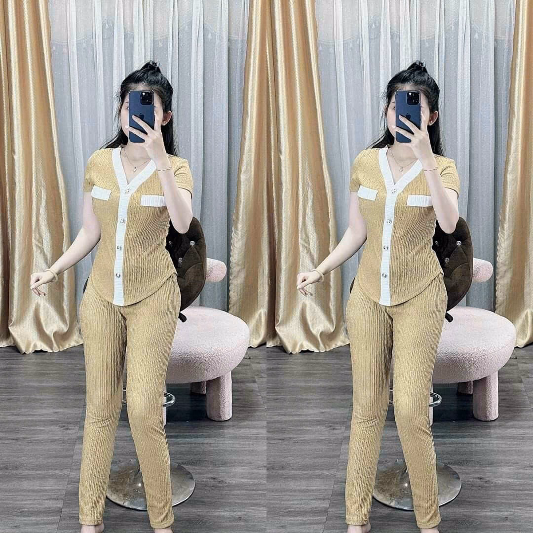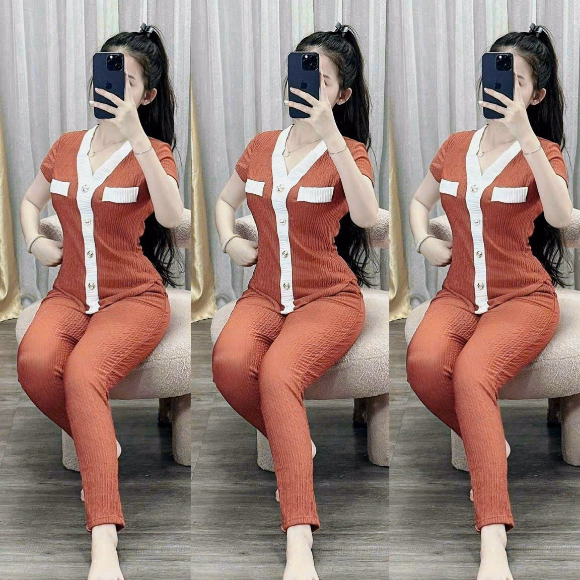 Tên sản phẩm: Set Bộ Đồ Nữ Áo Thun Cổ Tim Tay Ngắn Kèm Quần Dài Chất Thun Xốp M920