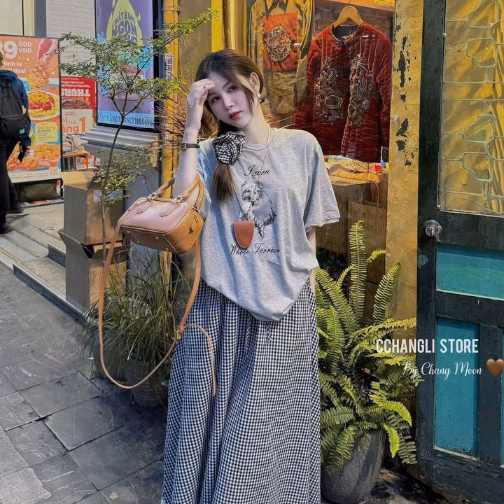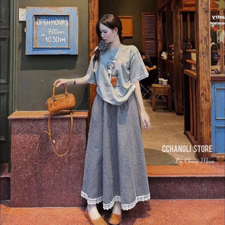 Set Bộ Đồ Nữ Áo Thun Cotton Tay Ngắn Mix Chân Váy Sọc Viền Ren Hoạ Tiết Siêu Xinh Basic Nữ