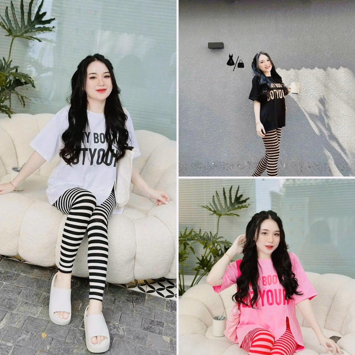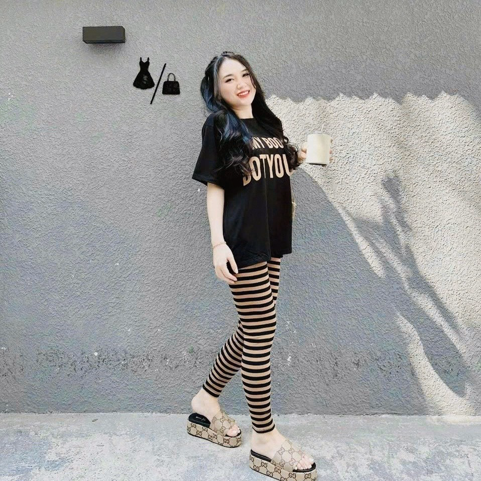Set Bộ Đồ Nữ Áo Thun In Chữ Xẻ Tà Mix Quần Legging Sọc Q37- Sam Store