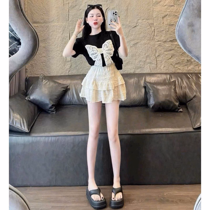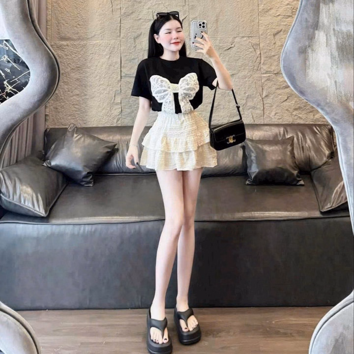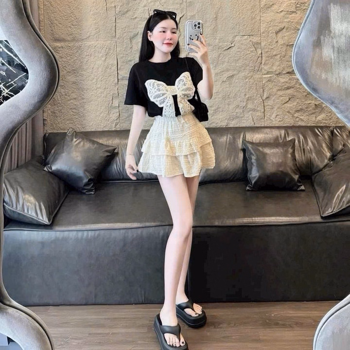 Set Bộ Đồ Nữ Chân Váy Xếp Tầng Kèm Áo Thun Phối Nơ Trước Ngực -Htm Fashion