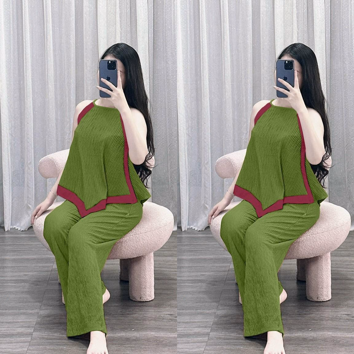 Set Bộ Đồ Nữ Thun Xốp Áo Cổ Yếm Viền Phối Quần Dài S19- Nana House