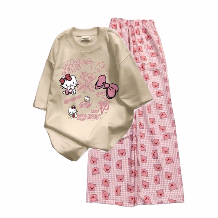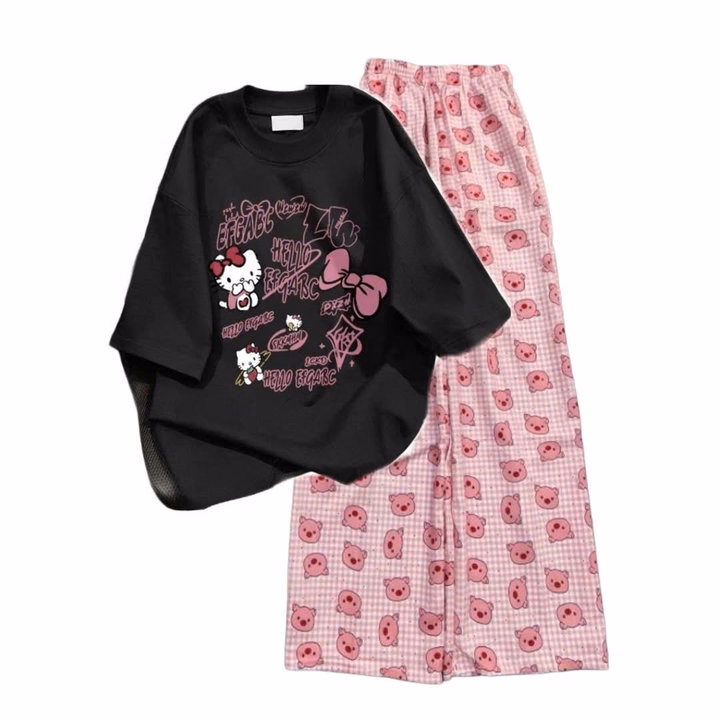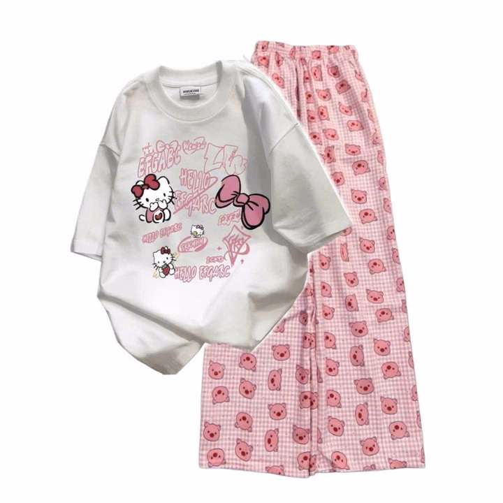 Sét Bộ Đồ Quần Hoạt Hình Heo Hồng + Mix Áo Phông Mèo Cute