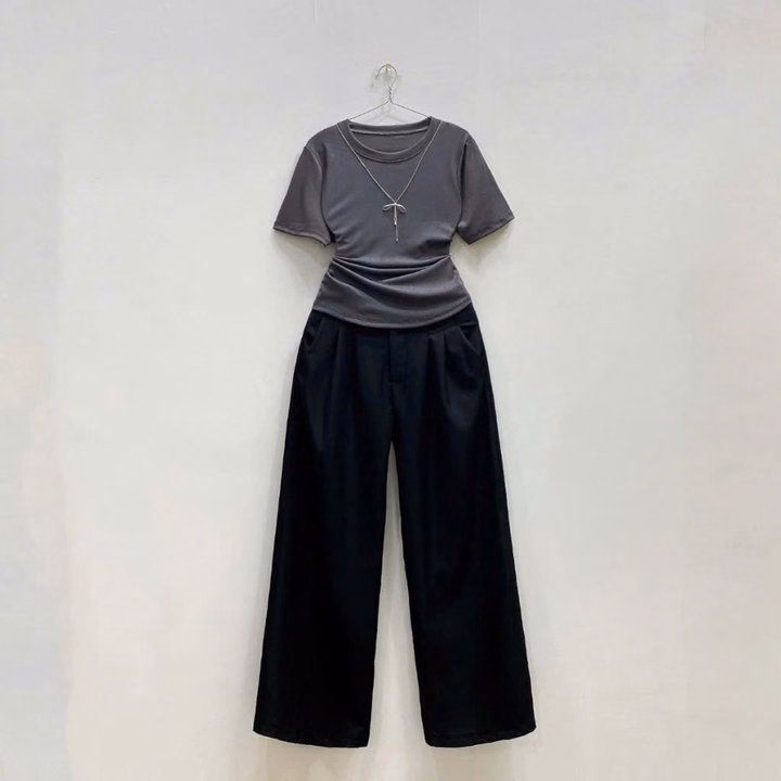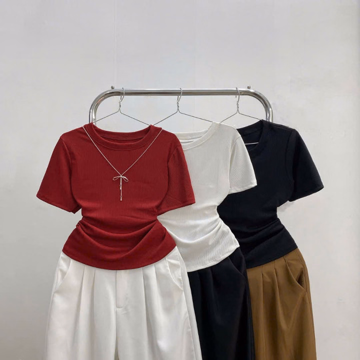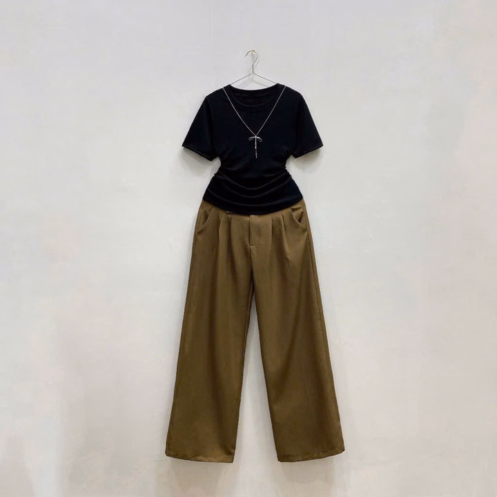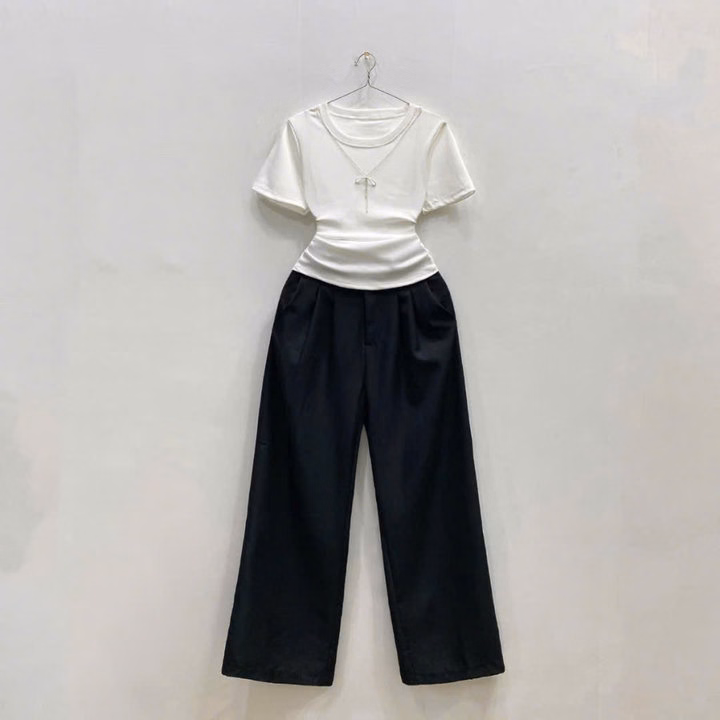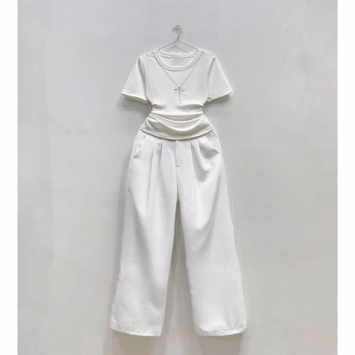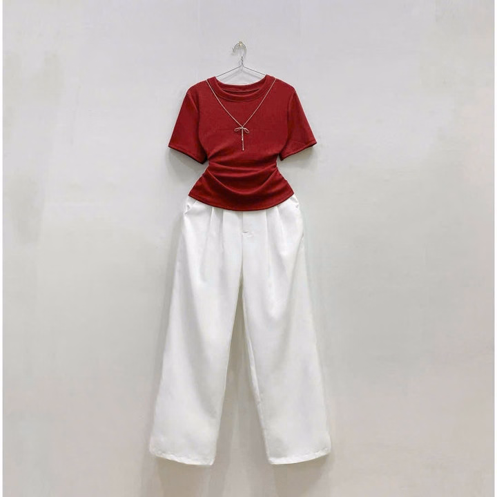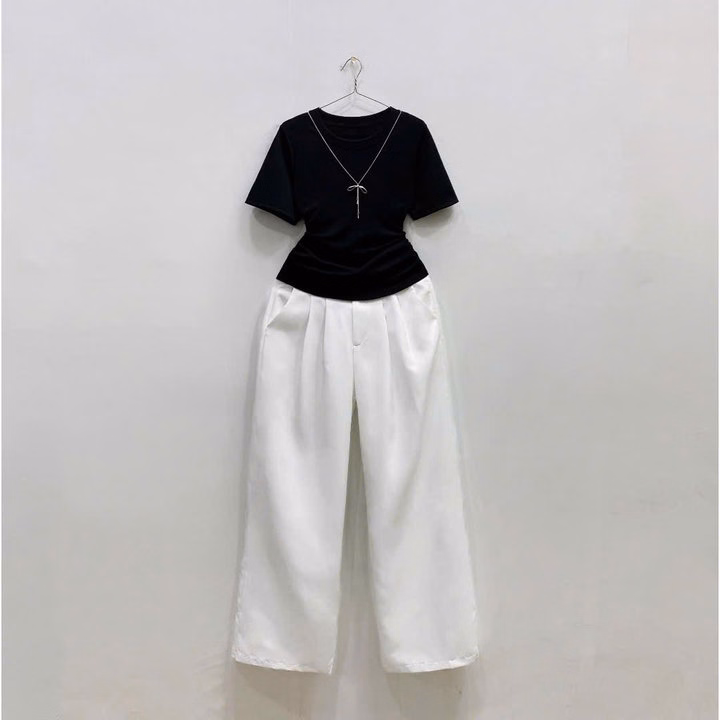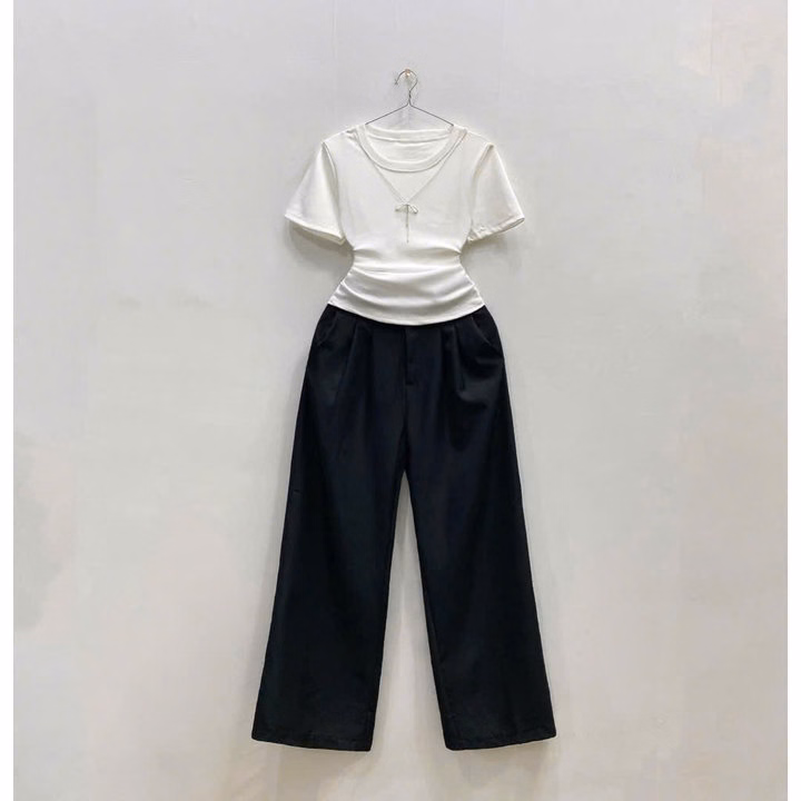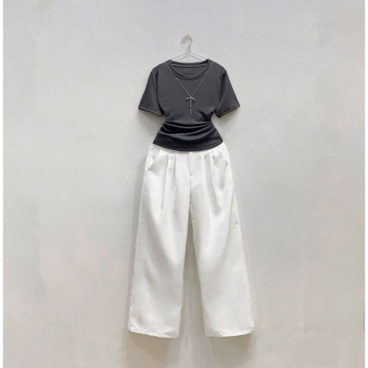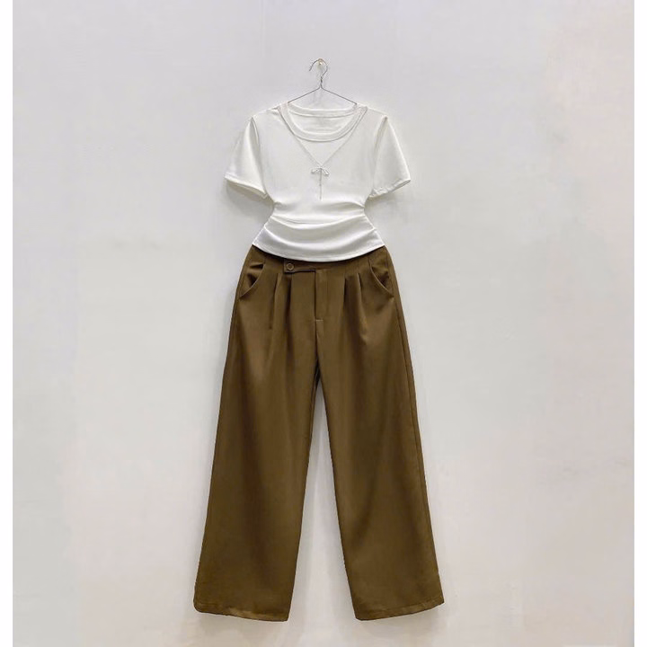 Sét Bộ Đồ Quần Kaki Trắng Dáng Dài 95Cm+ Mix Áo Thun Tăm Croptop Trơn Dáng Ngắn