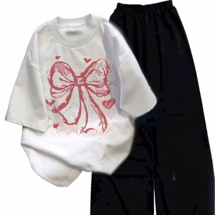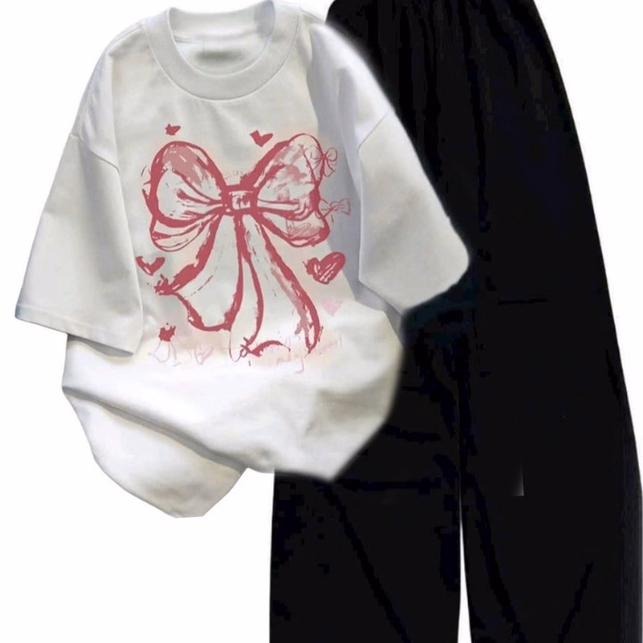 Sét Bộ Đồ Quần Ống Rộng Chun Đen + Áo Phông In Nơ Hồng Loang Màu Trắng