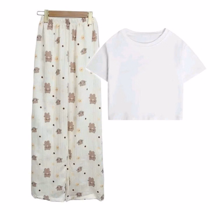 – Tên Sản phẩm: Sét bộ đồ quần ống rộng hoạt Hình gấu Nâu + mix áo croptop trơn tăm lạnh