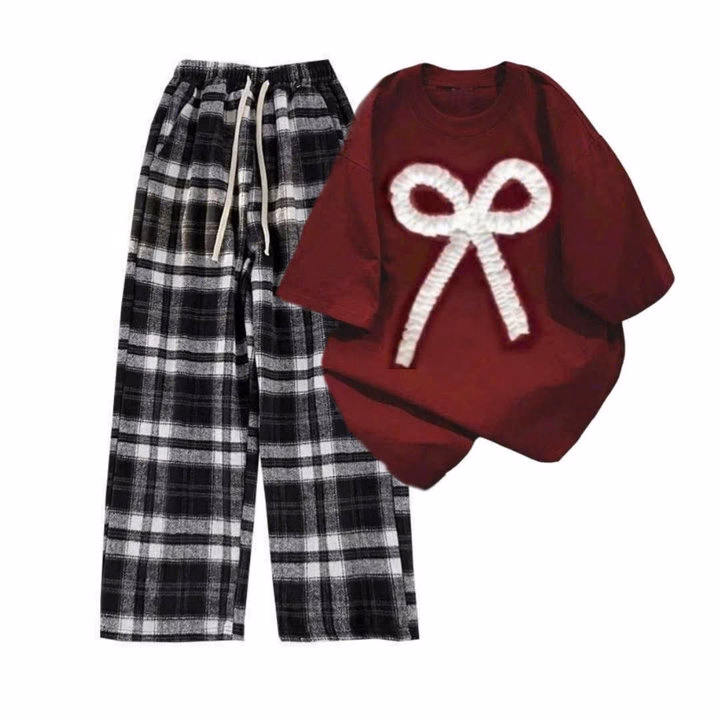 – Tên Sản phẩm: Sét bộ đồ quần ống rộng kẻ caro đen Bản To + Mix Áo phông nơ rúm đỏ