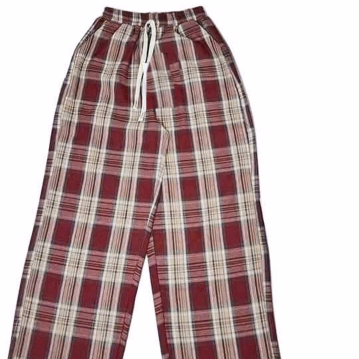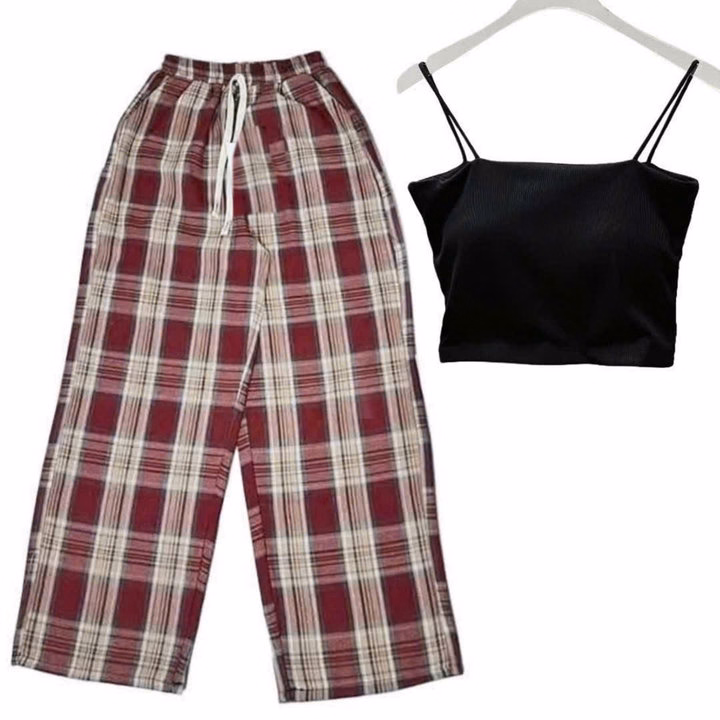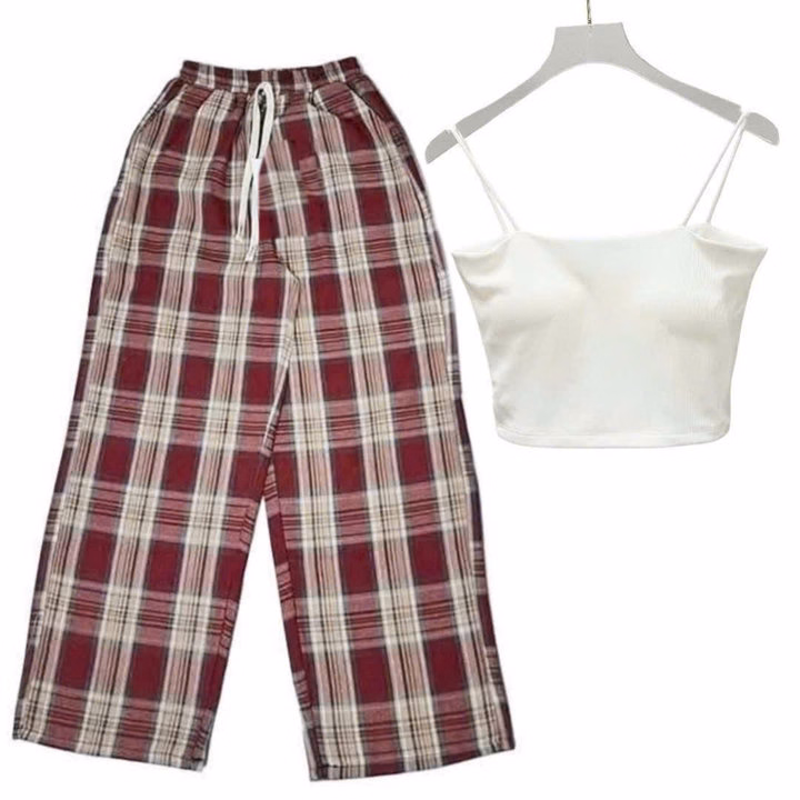 Sét Bộ Đồ Quần Ống Rộng Kẻ Caro Đỏ + Mix Áo 2 Dây Bún Chất Tăm Lạnh