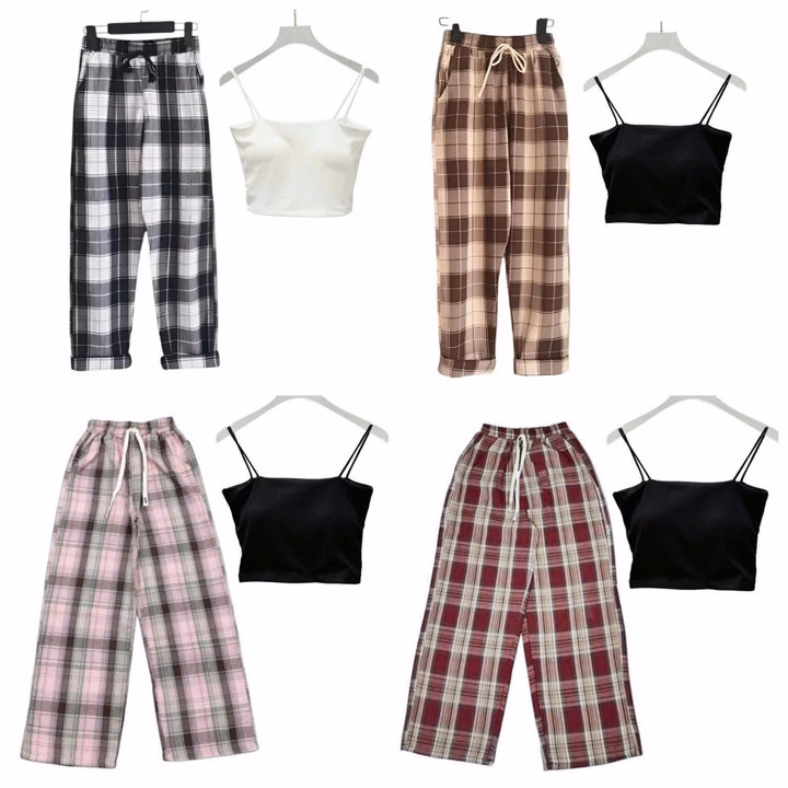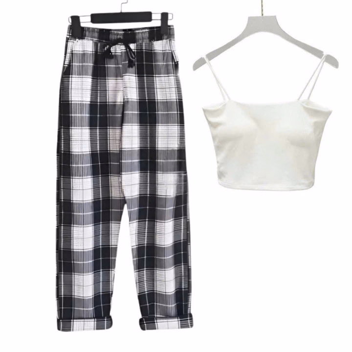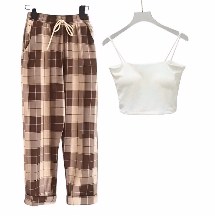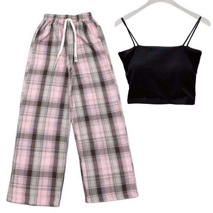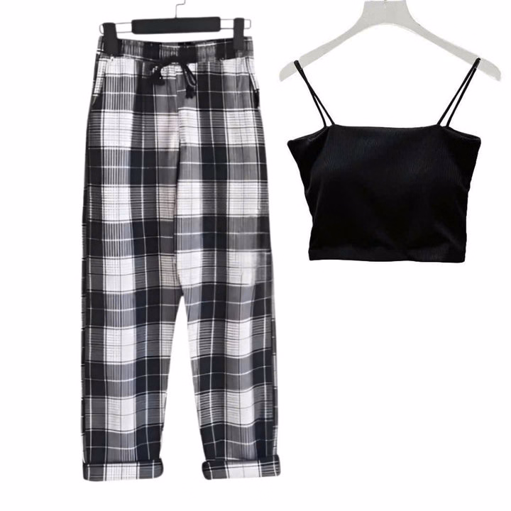 Sét Bộ Đồ Quần Ống Rộng Kẻ Caro + Mix Áo 2 Dây Bún Chất Tăm Lạnh