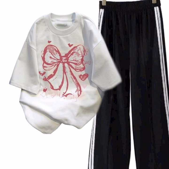 – Tên Sản phẩm: Sét Bộ Đồ Quần Viền Rót Ống Rộng+ áo phông in Nơ Hồng Loang màu trắng