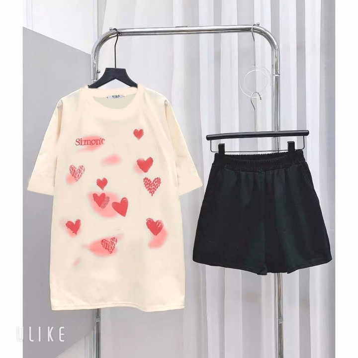 Sét Bộ Đùi Quần Su Trơn Đen + Mix Áo Phông Trái Tim Be Form Rộng
