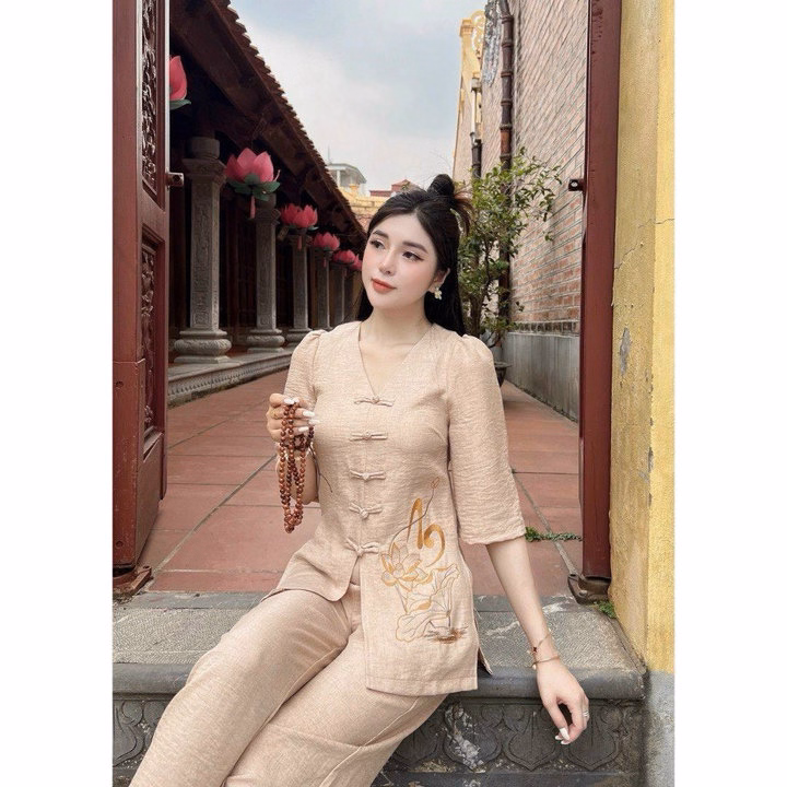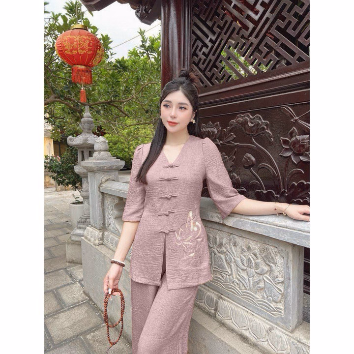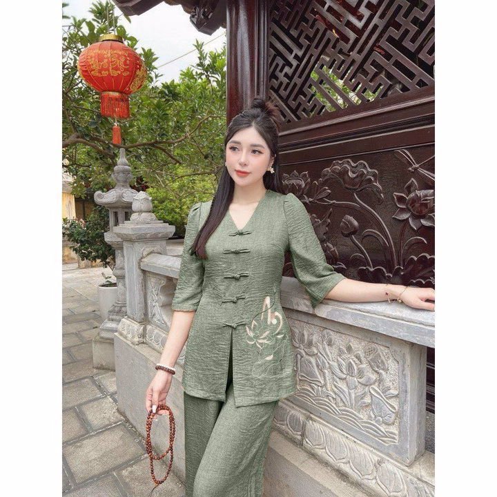Set Bộ Lam Đi Chùa Tay Lỡ Nút Mây St1152- Sam Store