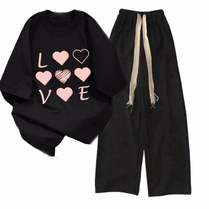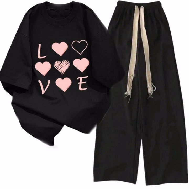 Sét Bộ Mùa Hè Quần Ống Rộng Dây Bản To Đen +Mix Áo Phông Form Rộng Tay Lỡ – Chữ Love