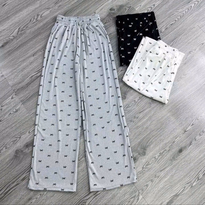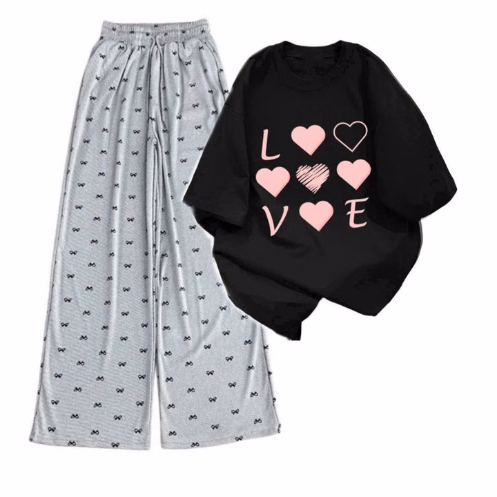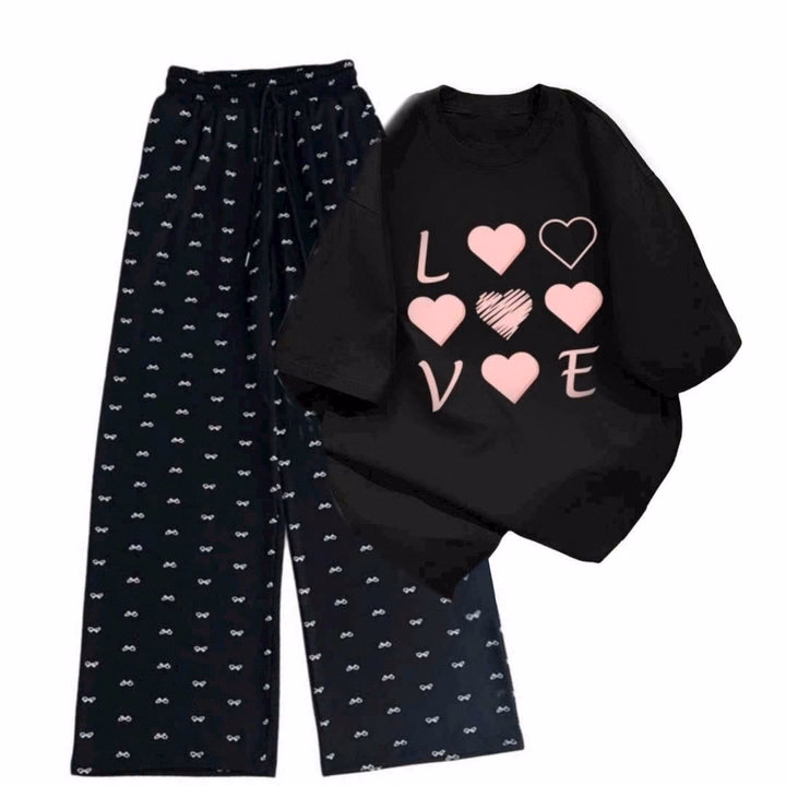 Sét Bộ Mùa Hè Quần Ống Rộng Họa Tiết Nơ Tăm +Mix Áo Phông Form Rộng Tay Lỡ – Chữ Love