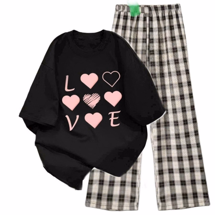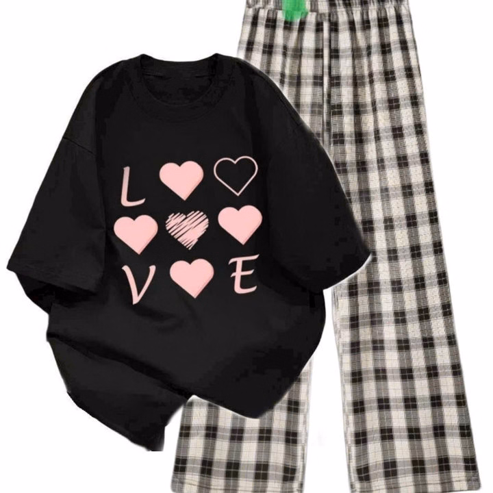 Sét Bộ Mùa Hè Quần Ống Rộng Kẻ Caro Đen +Mix Áo Phông Form Rộng Tay Lỡ – Chữ Love