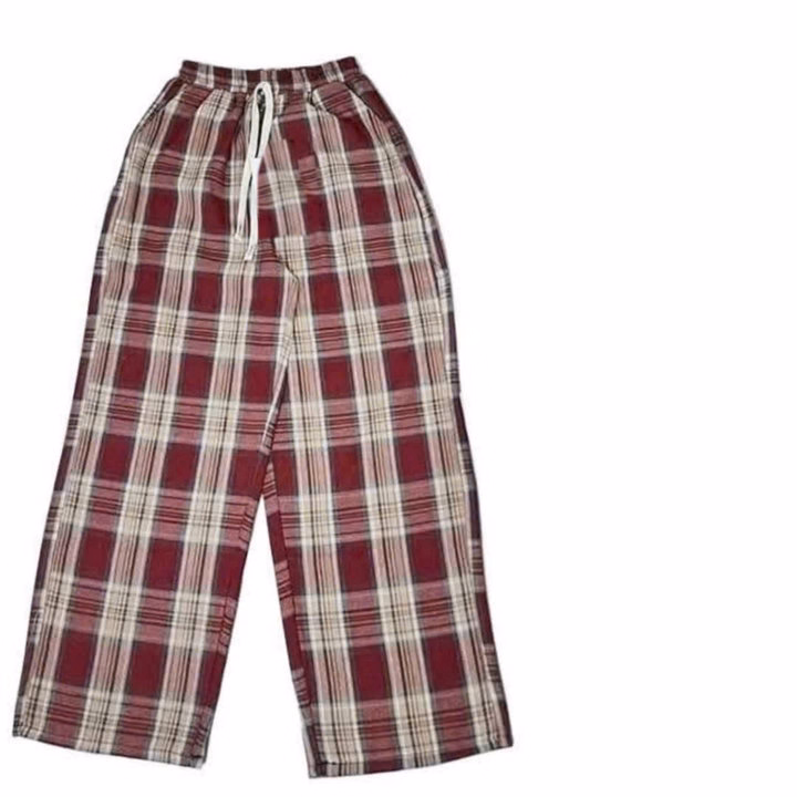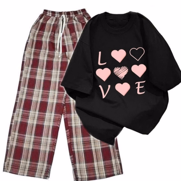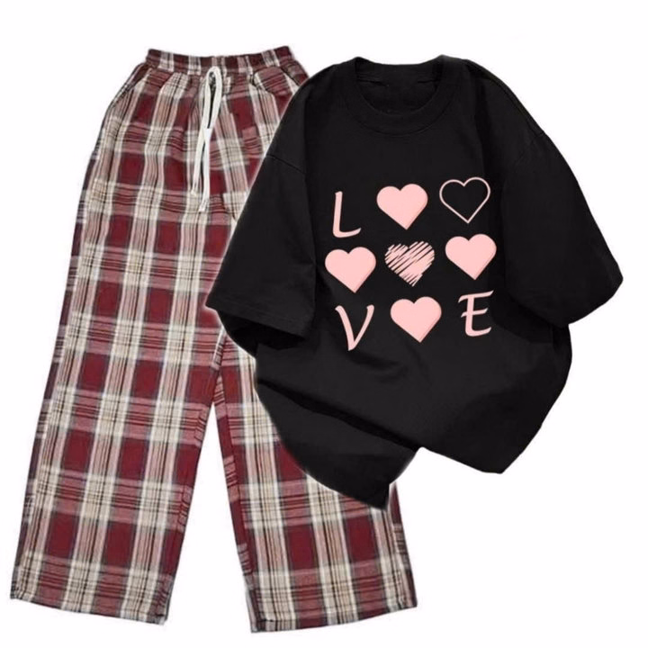 Sét Bộ Mùa Hè Quần Ống Rộng Kẻ Caro Đỏ +Mix Áo Phông Form Rộng Tay Lỡ – Chữ Love