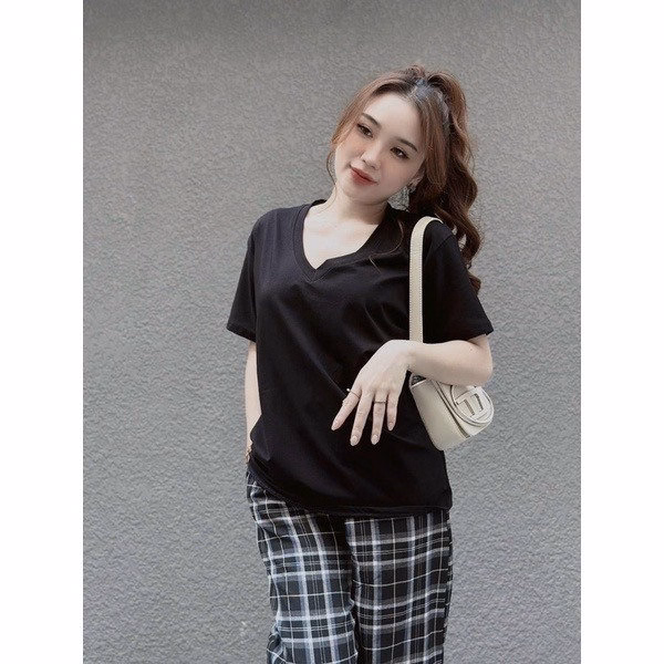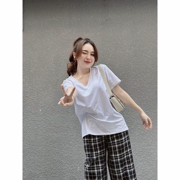 – Tên Sản phẩm: Set Bộ Nữ Quần Caro Rộng Cạp Chun + Áo Phông Cổ Tim Thụng