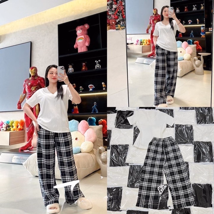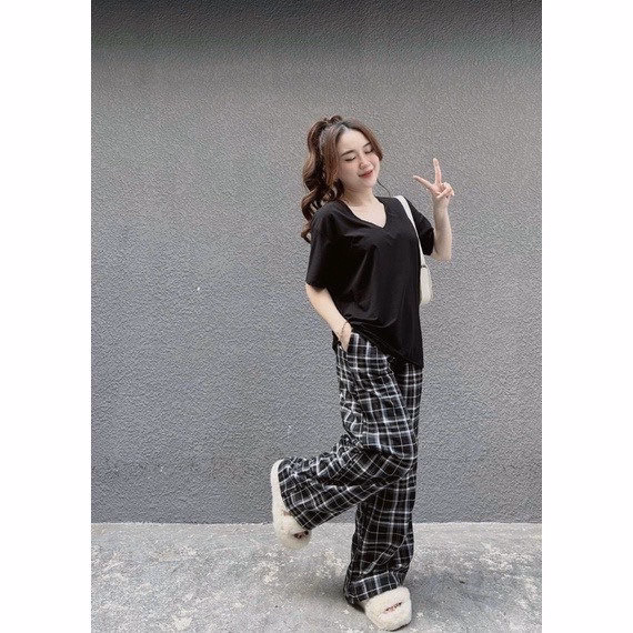 Set Bộ Nữ Quần Caro Rộng Cạp Chun + Áo Phông Cổ Tim Thụng