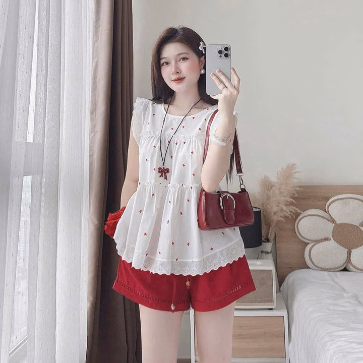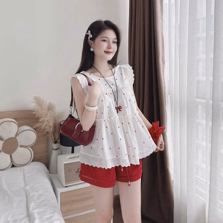 Set Bộ Nữ Trái Tim Đỏ Cánh Tiên Viền Ren Mix Quần Short Đùi Cặp Chun Mặc Nhà Đi Chơi Siêu Xinh T105