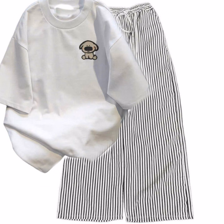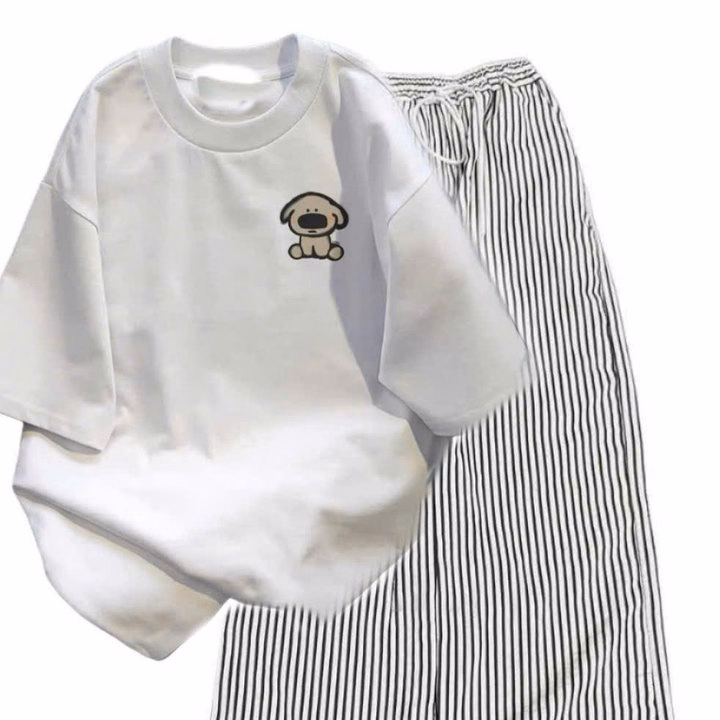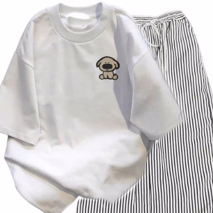 – Tên Sản phẩm: sét bộ quần đũi xốp kẻ sọc + mix áo phông in hình cún nâu ở ngực
