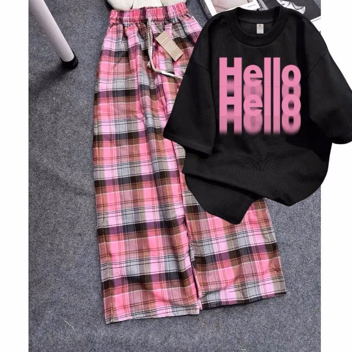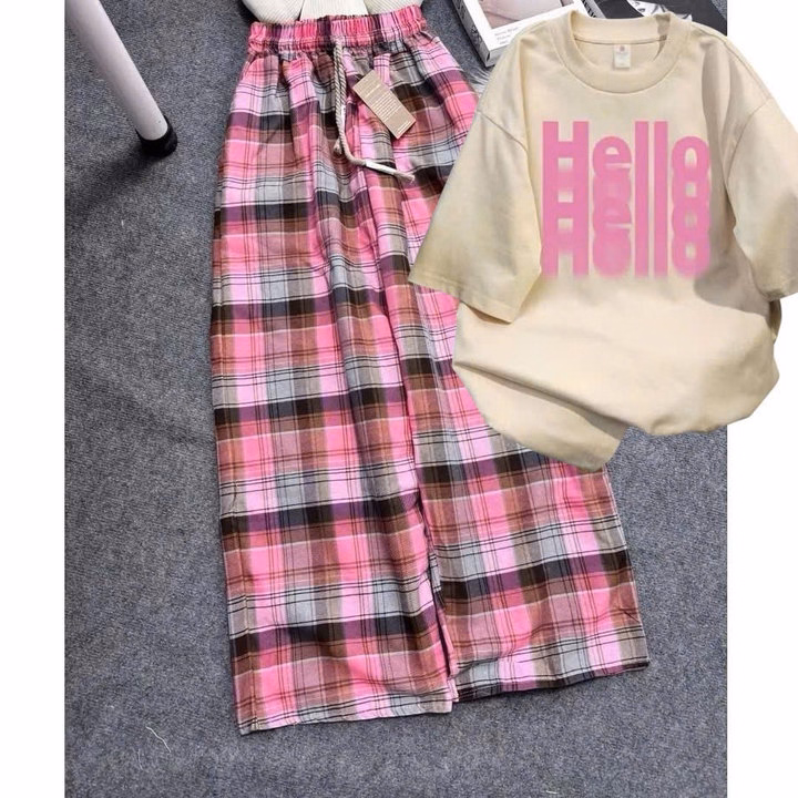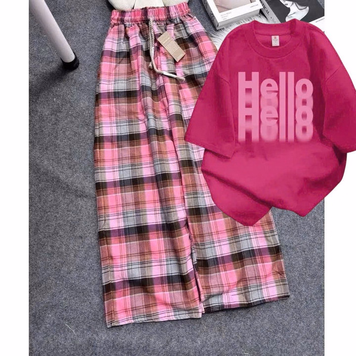 Sét Bộ Quần Kẻ Caro + Mix Áo Phông Form Rộng Tay Lỡ -Hello