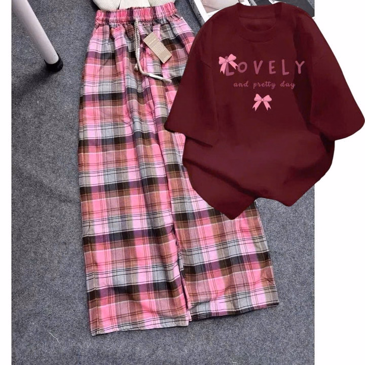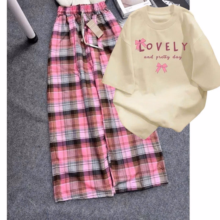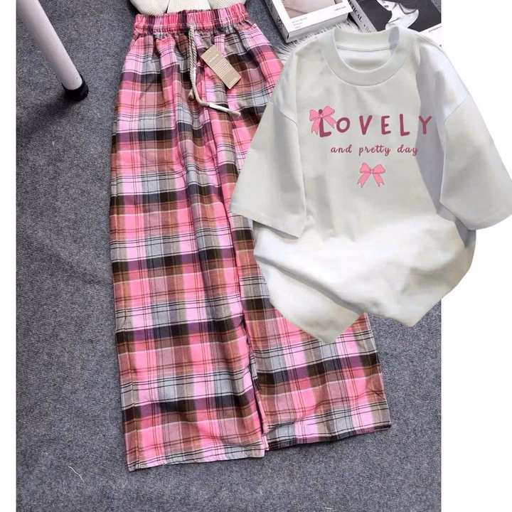 Sét Bộ Quần Kẻ Caro + Mix Áo Phông Form Rộng Tay Lỡ -Lovely