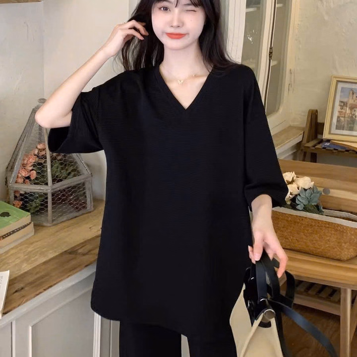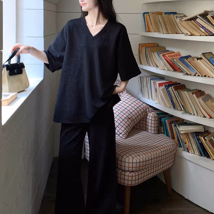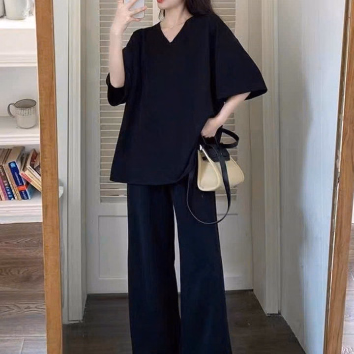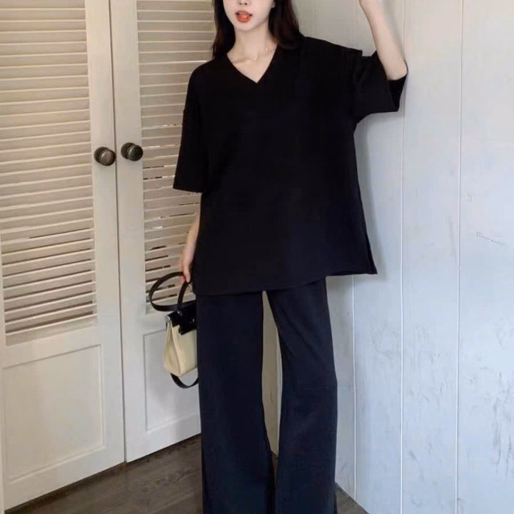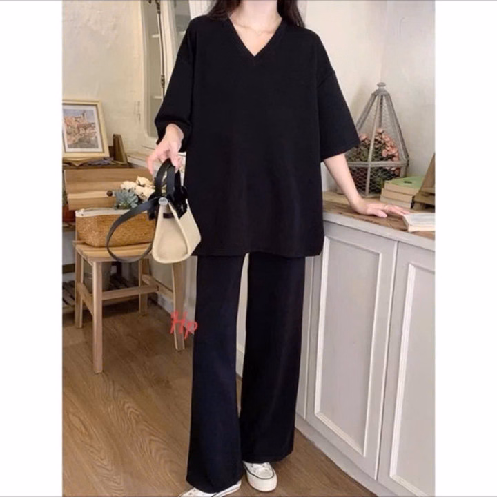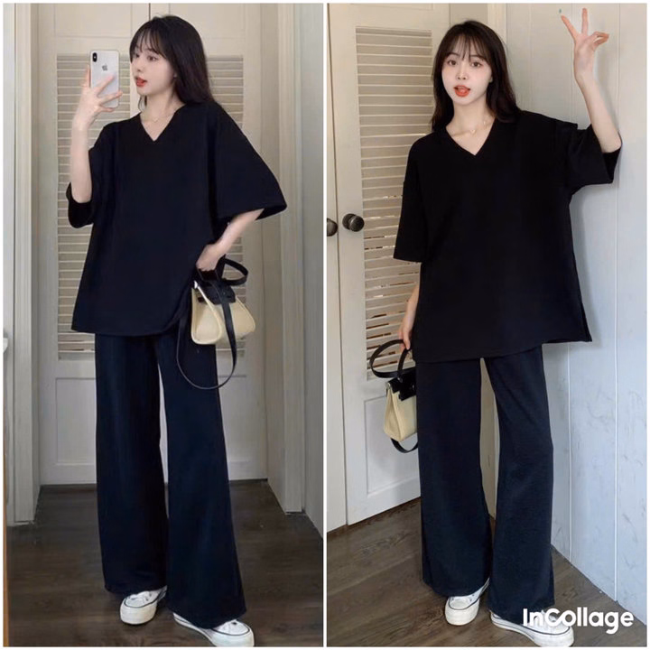 Sét Bộ Quần Ống Rộng Cạp Chun Đen Hack Dáng + Mix Áo Phông Tim Trơn Thụng