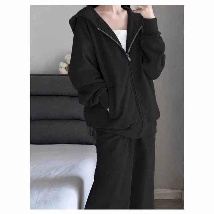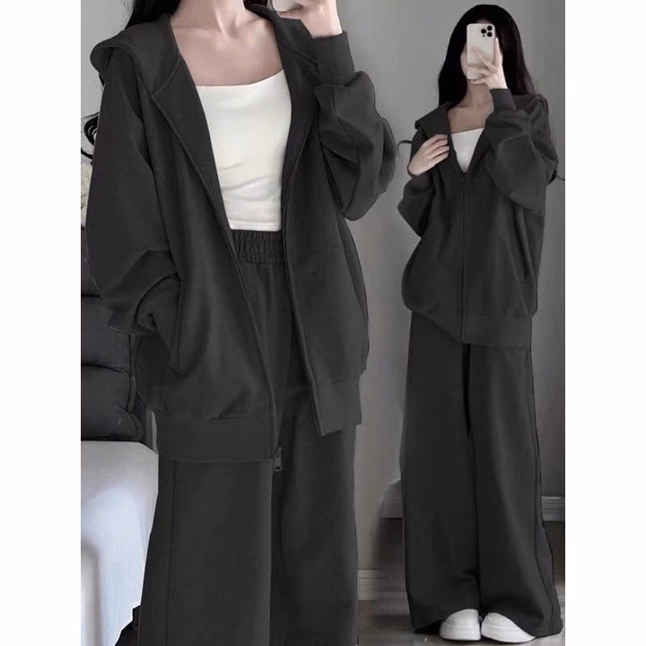 Sét Bộ Quần Ống Rộng Cạp Chun Hack Dáng + Mix Áo Khoác Nỉ Form Rộng Mũ 2 Lớp