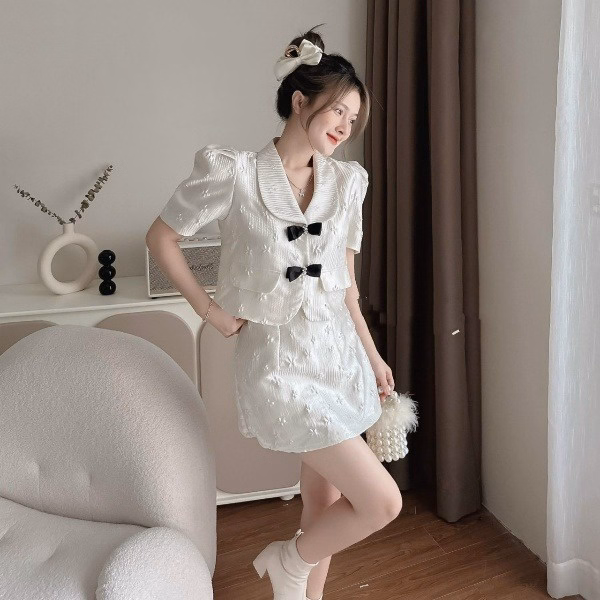 Tên sản phẩm: Set Chân Váy Có Lót Kèm Áo Tay Phồng Cổ Chữ V Cài Nút Đính Nơ Chất Xốp Phồng Hoa T586