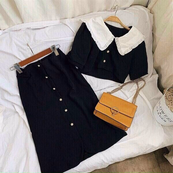 Set chân váy công sở cổ bèo tiểu thư có đính nút xinh xỉu