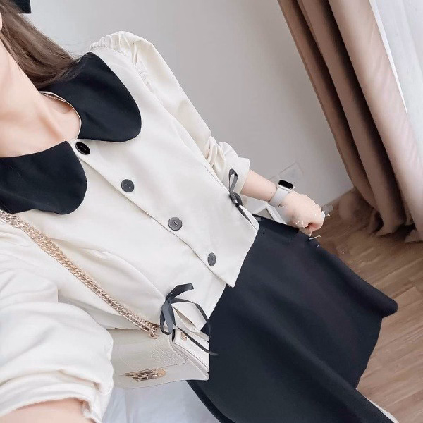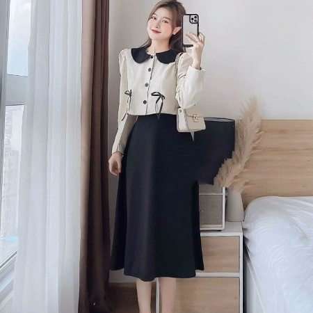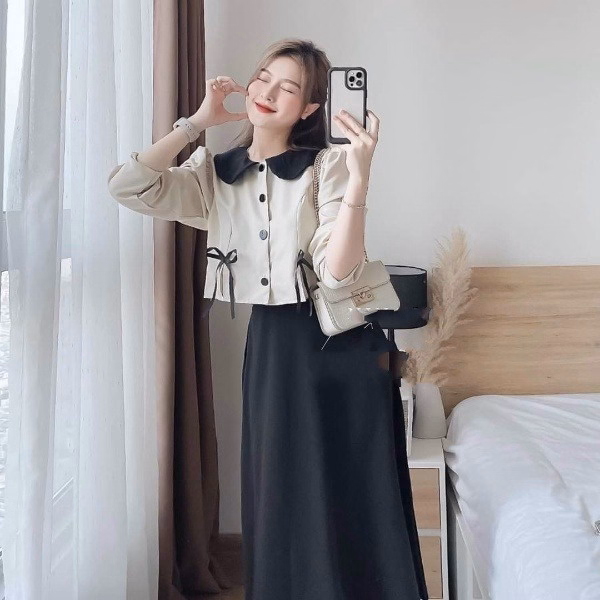 Set Chân Váy Kèm Áo Tay Dài Phối Bèo Cổ Cài Nút Thật V41 – Haka Mây