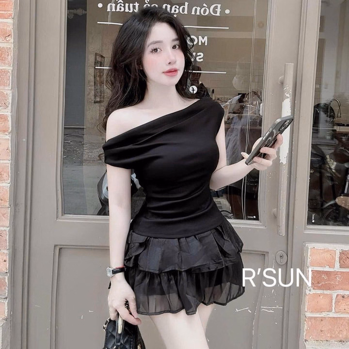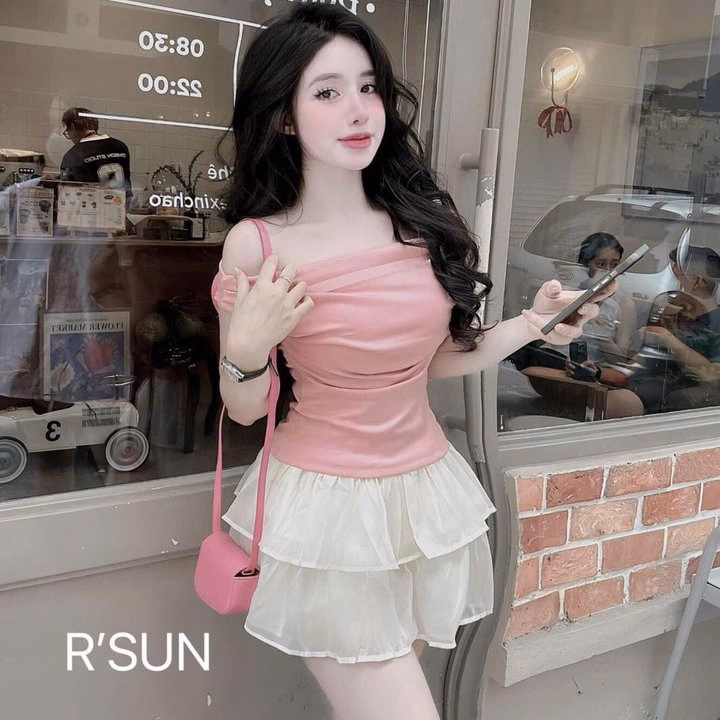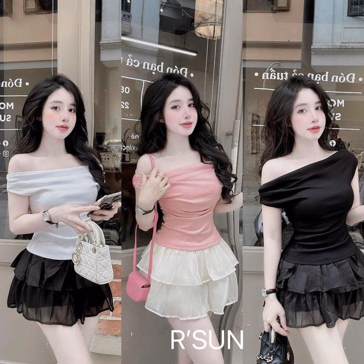 Set Chân Váy Ngắn Xòe Tầng Phối Áo Tăm Lạnh Trễ Vai Tb85Gd