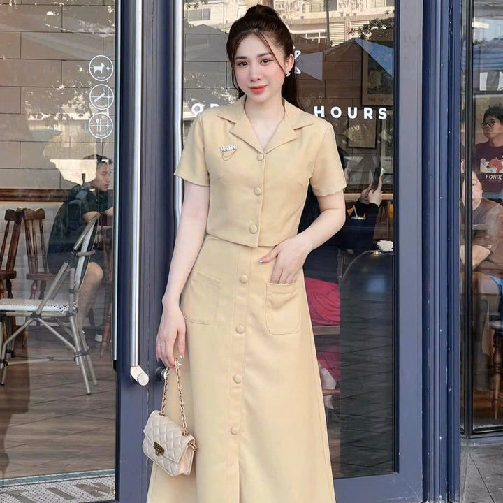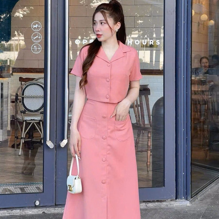 Set Cotton Lạnh Phối Chân Váy Dài Lưng Thun Khóa Kéo Nút Bọc Bt105T- Sam Store