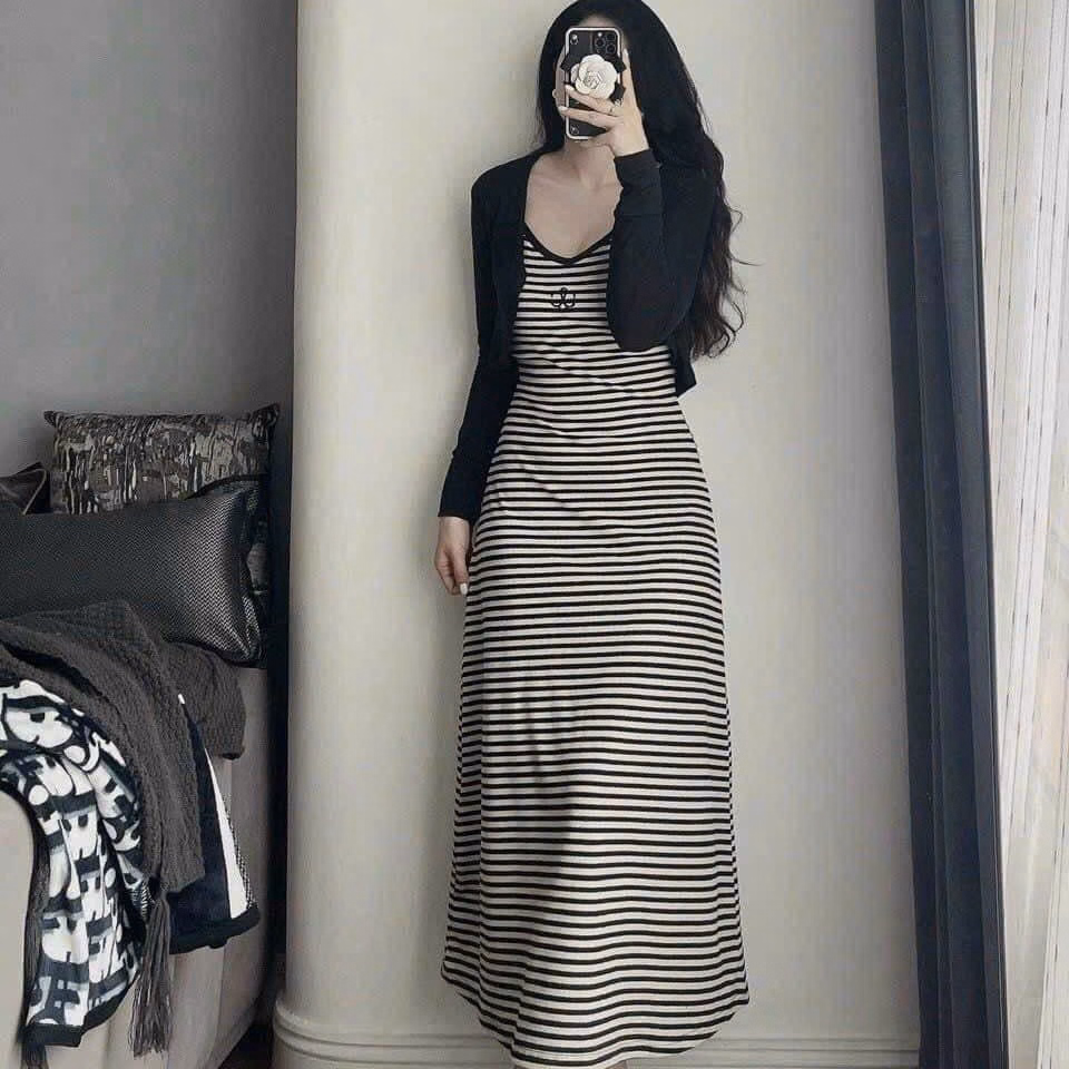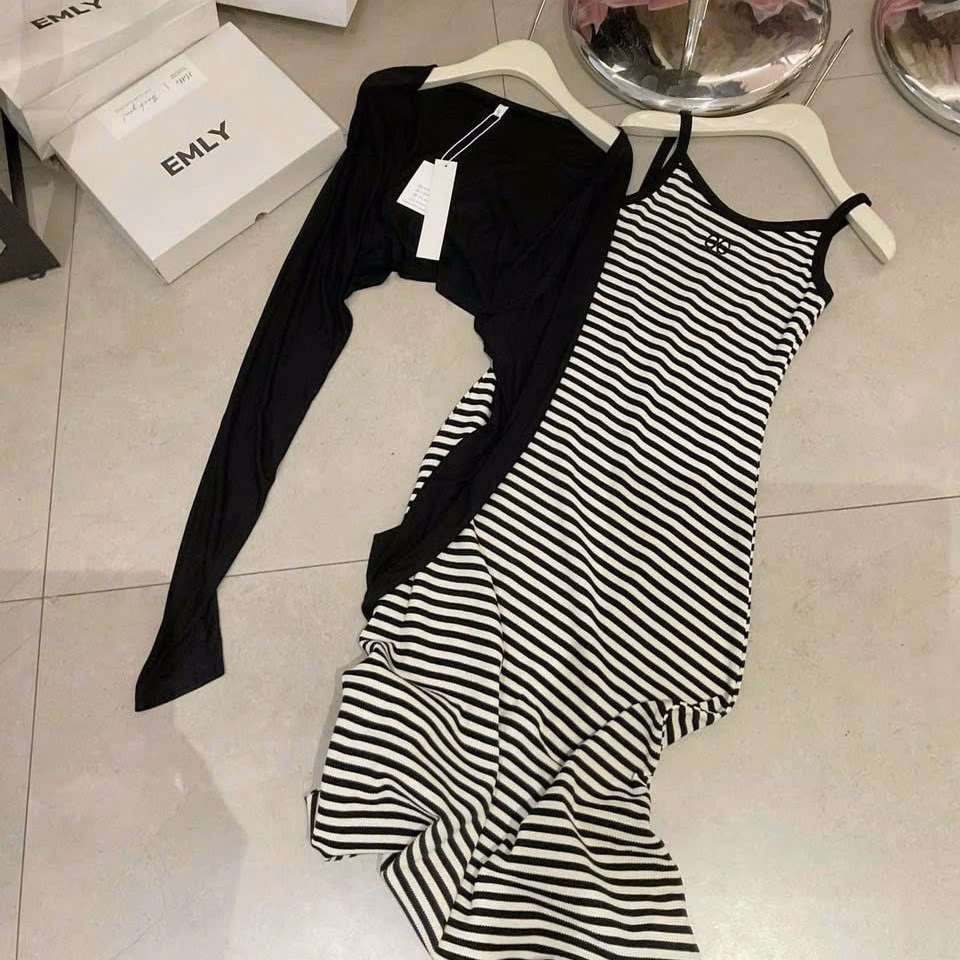 Set đầm body hai dây kèm áo khoác tay dài vừa tiện lợi vừa thời trang.