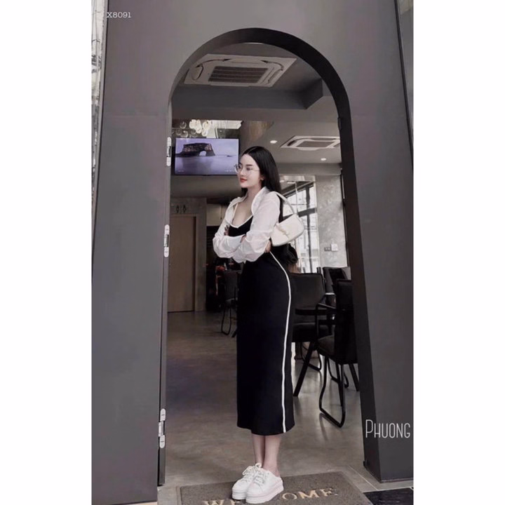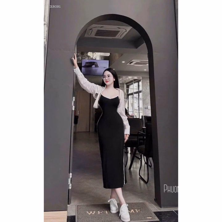 Set đầm body hai dây dáng dài kèm áo khoác tay dài vừa tiện lợi vừa thời trang.