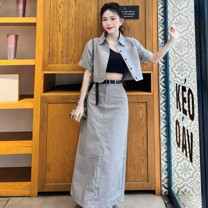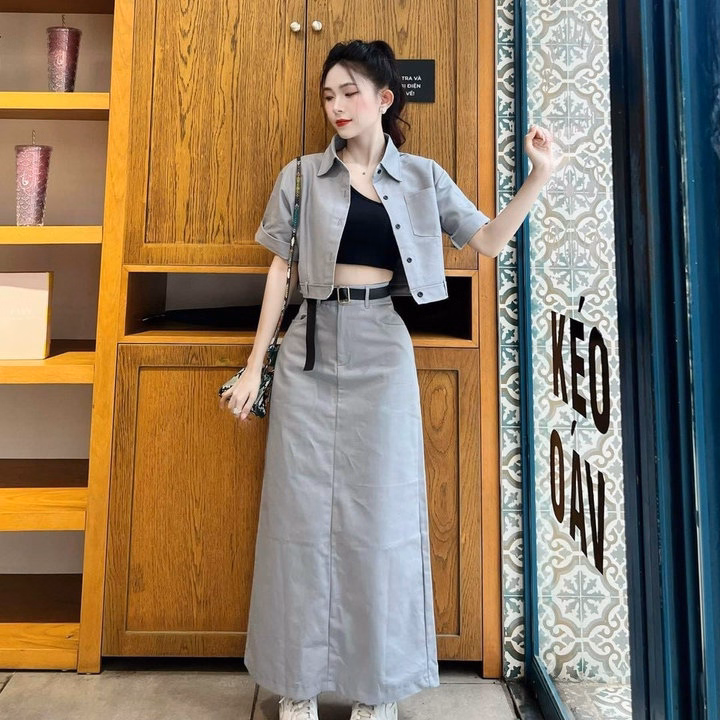 Set Đầm Váy Áo Khoác Kaki Kèm Nịt Mix Áo Thun Tăm Lạnh Sh1108- Sam Store