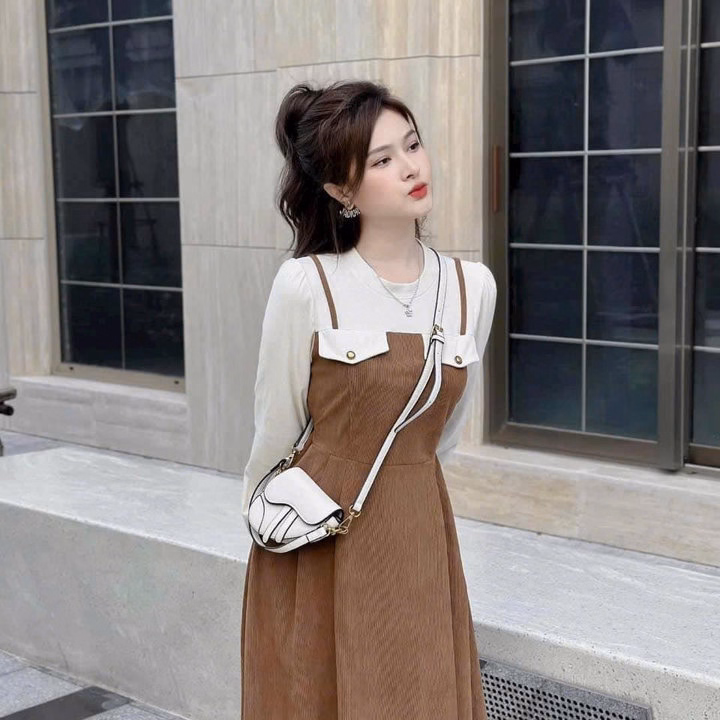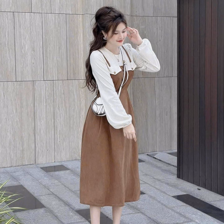 Set Đầm Yếm Nhung Tăm Phối Áo Gân Lạnh Tay Dài Sh1005- Sam Store